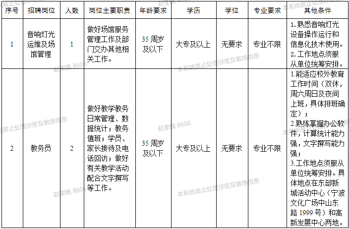 根据宁波市青少年宫(市志愿者服务指导中心)工作需要,为进一步加强队伍建设,充实工作力量,现面向社会公开招聘编外工作人员3名。 具体事宜公告如下: 一、用人单位简介 宁波市青少年宫(市志愿者服务指导中心)为共青团宁波市委下属事业单位,分类类别为公益二类,机构规格为正处级,经费预算形式为财政适 当补助。主要职责是:推进未成年人思想道德和社会主义核心价值观教育实践活动;开展青少年校外科技体育、文化艺术、劳动实践、自护体验、 国防教育和对外交流等公益性教育教学体验活动;协助做好全市少先队组织建设和主题教育实践工作;开拓青少年社会事务服务和“青”字号项目 实施;做好全市志愿者及志愿服务日常管理运行工作。 二、招聘原则和办法 招聘工作坚持公开、平等、竞争、择优原则,按照德才兼备的用人标准,采取公开报名、统一考试和择优录用的办法进行,通过笔试、面试、体检 和考察等程序面向社会公开招聘编外工作人员。 三、招聘对象基本条件 (一)遵守中华人民共和国宪法、法律和法规; (二)遵守纪律、品行端正,具备良好的职业素质; (三)具有招聘岗位所需的学历、资历、专业、任职资格、职业(执业)资格及技能要求; (四)具有适应岗位要求的身体条件; (五)具备岗位所需的其他条件。 四、招聘岗位、人数、专业、学历及其他条件  注:学历(学位)取得时间以及年龄、工作经历的计算截止时间均为公告发布之日;2024年全日制普通高等院校应届毕业生凭就业协议和学校 推荐表报名,且须在2024年9月30日前取得相应的学历(学位);2023年9月1日至2024年8月31日毕业的国(境)外留学回国(境)人员也可 等同于国内2024年全日制普通高等院校应届毕业生凭国(境)外学籍证明报名,且须在2024年12月31日前取得教育部中国留学服务中心出具的 国(境)外学历、学位认证书,专业相近的以所学课程名称为准。 五、招聘办法和步骤 (一)报名与资格审查 1.报名办法 本次招聘采取网络报名方式。 时间:2024年3月11日9时—3月15日16时。 报名人员登录宁波市考试网上报名系统(https://bmxt.nbhr.org.cn/),选择进入“宁波市青少年宫(市志愿者服务指导中心)2024年招聘编外 工作人员”,在仔细阅读公告信息后,按要求输入个人信息,严格按照招聘所设条件选择岗位进行报名。每位报名人员只能选报一个职位。逾期 不再受理注册及报名。 2.资格初审 时间:2024年3月16日9时—3月19日16时。 招聘单位对应聘人员的报考资格进行初审期间,报名系统不再对报考人员开放。证件不全或提供证件与报考资格条件不相符者,不能通过报名资 格初审。 报考人员可在2024年3月20日9时—3月20日16时登陆宁波市考试网上报名系统查询初审结果。 符合招聘条件的报名人数与招聘计划数之比不能低于3:1,在规定的时间内,符合报考条件的报名人数和招聘计划数比例不足3:1的,将核减该 岗位拟招聘人数或取消该岗位招聘。 3.下载打印准考证 时间:2024年3月25日9时—3月25日16时。 通过资格初审的报名人员在规定时间内登录宁波市考试网上报名系统,下载打印准考证。 (二)考试 本次公开招聘考试采取笔试+面试相结合的办法进行;笔试、面试均委托具有考试命题资质的独立第三方机构命题。 1.笔试 笔试内容为招聘岗位应知应会的综合知识,笔试卷面总分为100分(不足60分者淘汰)。笔试时间、具体地点和有关事项详见准考证,考生凭身份 证和准考证参加笔试。 笔试后,根据笔试成绩从高分到低分按1:3比例确定面试对象(不足比例的按实际人数进入)。笔试成绩和进入面试人员名单于笔试结束15个工 作日内在宁波市青少年宫网站(http://www.nbqs.net.cn)上公布,同时公布面试时间、地点。 2.资格复审 面试前,招聘单位将对入围人员进行资格复审,具体时间、地点另行通知。参加资格复审者请携带身份证、学历学位证书(2024年全日制普通高 等院校应届毕业生凭就业协议和学校推荐表,2023年9月1日至2024年8月31日毕业的国境外留学回国境人员也可凭国境外学籍)等原件及复印 件。证件(证明)不全或所提供的证件(证明)与报考资格条件不相符者,不能通过资格复审;不按规定的时间和地点参加资格复审者视作自 动放弃;因资格审查未通过或自动放弃而产生的空缺面试名额,按笔试成绩从高分到低分依次替补并参加资格复审。通过资格复审的考生现场 领取《面试通知》。 3.面试 面试主要测试应聘人员专业知识、口头表达能力、应变能力、分析能力、回答问题准确性和举止仪表等,面试总分为100分(不足60分者淘汰)。 考生凭身份证和准考证,按照《面试通知》上规定的时间和地点参加面试。面试对象不按规定的时间和地点参加面试的,视作放弃面试;由此产 生的面试空缺名额不替补。 4.成绩 考试总成绩为笔试成绩的50%和面试成绩的50%之和,满分100分。在面试合格人员中,按总成绩从高分到低分按1:1的比例确定体检、考察对 象,总成绩相同,按笔试成绩排序,总成绩和笔试成绩都相同的增加考试科目。面试和考试总成绩以及参加体检与考察人员名单于面试结束3个工 作日内在宁波市青少年宫网站(http://www.nbqs.net.cn)上公布。 (三)体检与考察 参加体检人员在网上下载体检通知(或在接到电话通知)后,按要求时间到指定地点参加体检,体检标准参照《浙江省国家公务员录用体检标准 (试行)》执行。 体检结束后,
