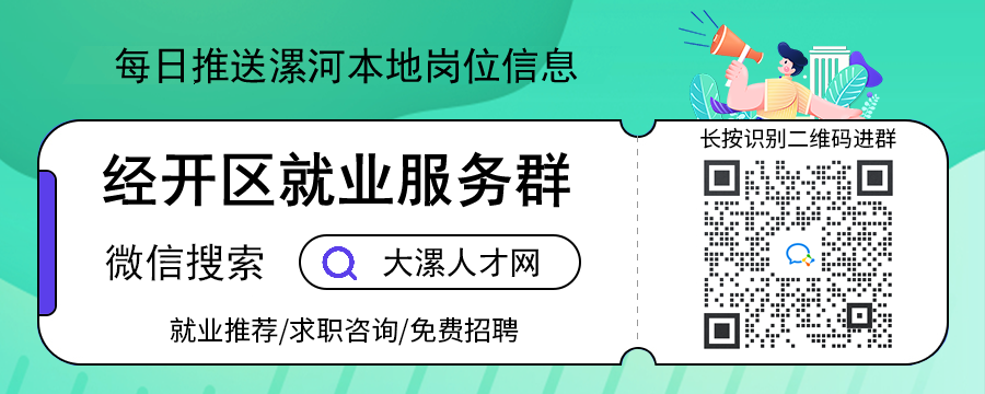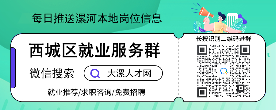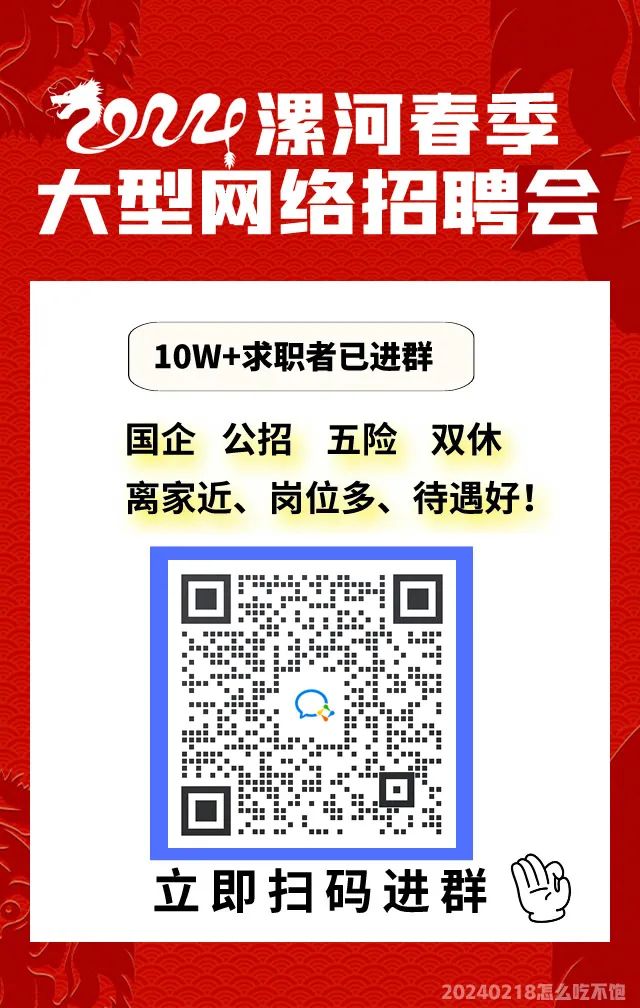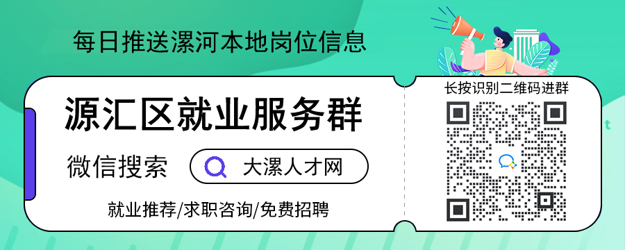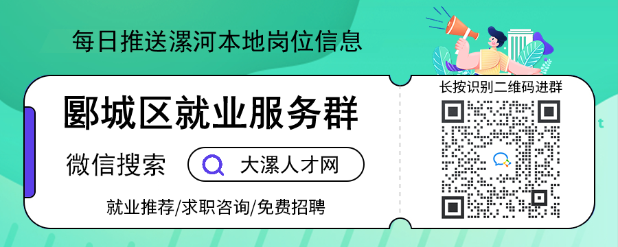 好工作 免费聊 人才客服:17339509700(微信同号) 赶 ![]() 快 ![]() 进 ![]() 群 ↓长按识别下方二维码↓ 群内每天推送本地最新招聘信息 找工作、换工作的赶紧加入 这么一个能知晓漯河本地工作的微信群 你还不来吗? 找工作/招人才,就上大漯人才网! // 求 ![]() 职 ![]() 福 ![]() 利 长按识别下方二维码进群添加好友↓