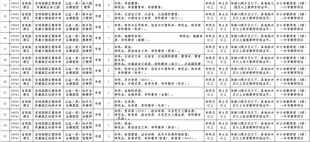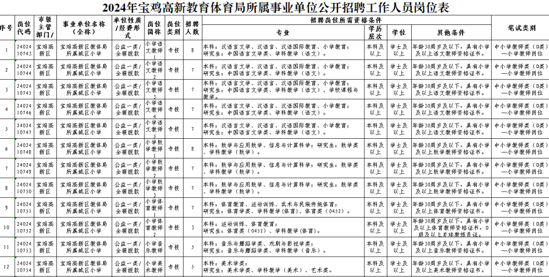根据《事业单位人事管理条例》《陕西省事业单位公开招聘工作人员实施办法》及相关规定,2024年宝鸡市事业单位面向社会统一公开招聘(募)工作人员1251名(含“三支一扶”计划30名)。其中宝鸡高新区教育体育局所属事业单位公开招聘98人。