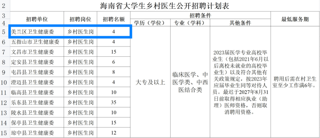 海南省大学生乡村医生公开招聘计划表