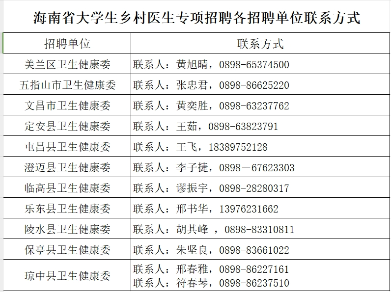 海南省大学生乡村医生专项招聘各单位联系方式
