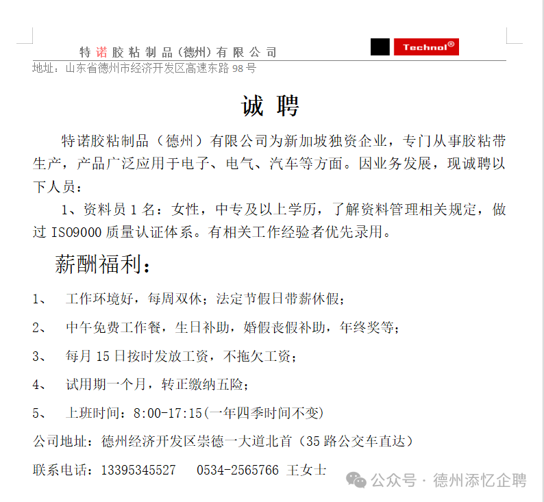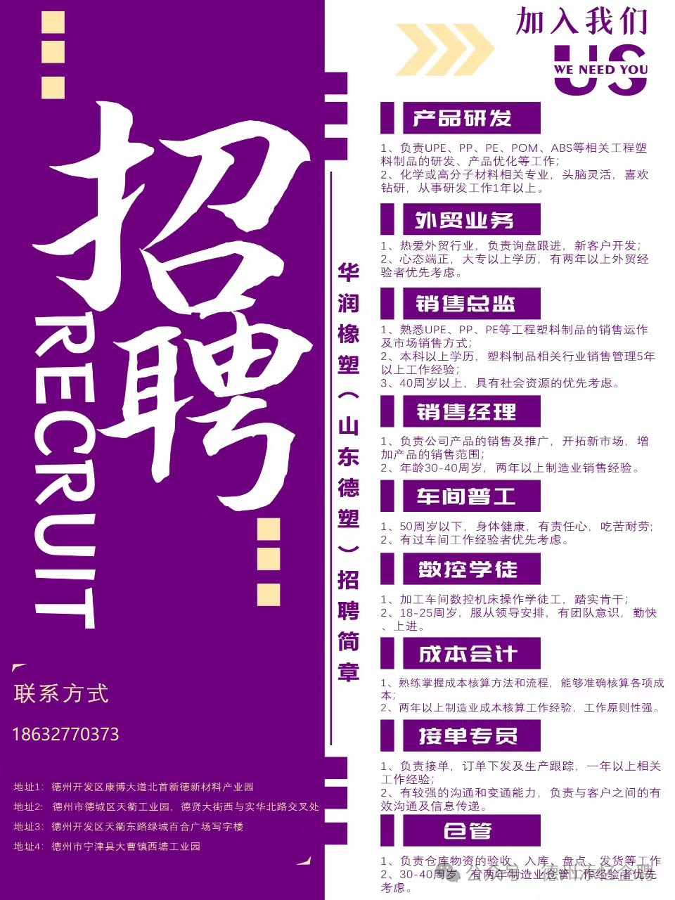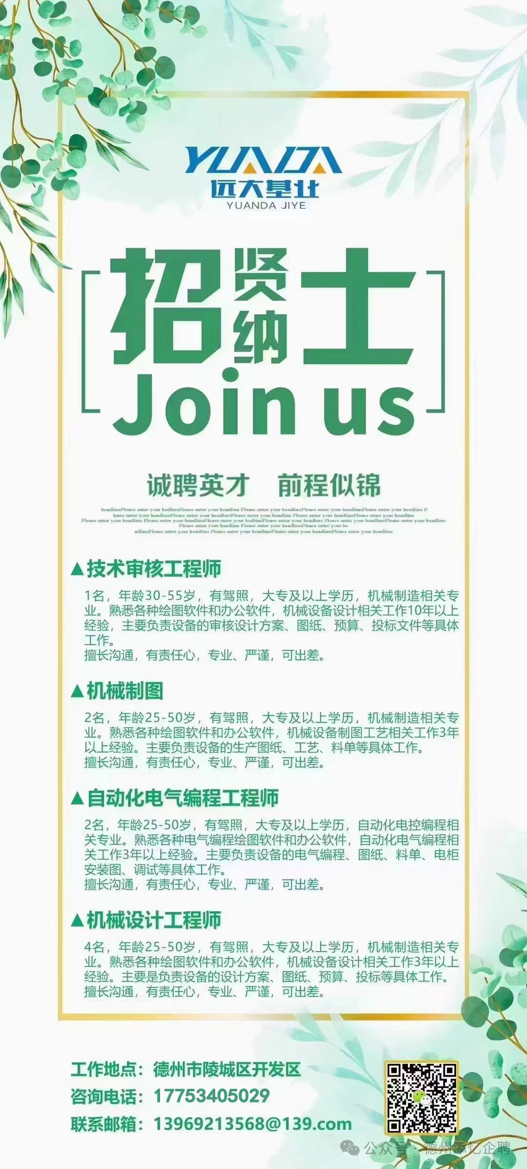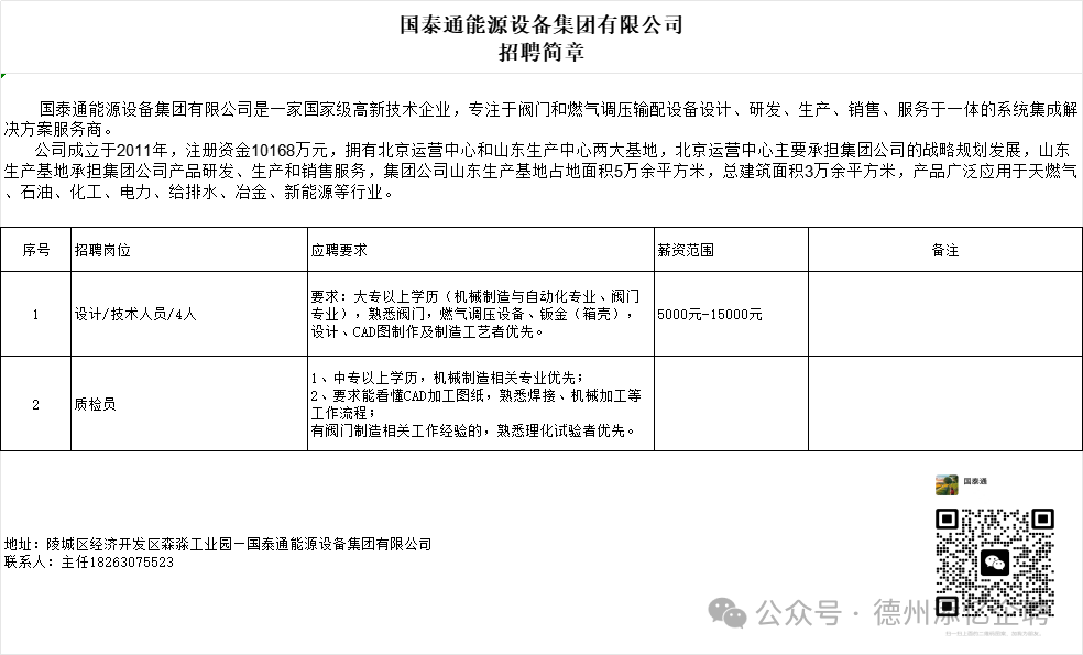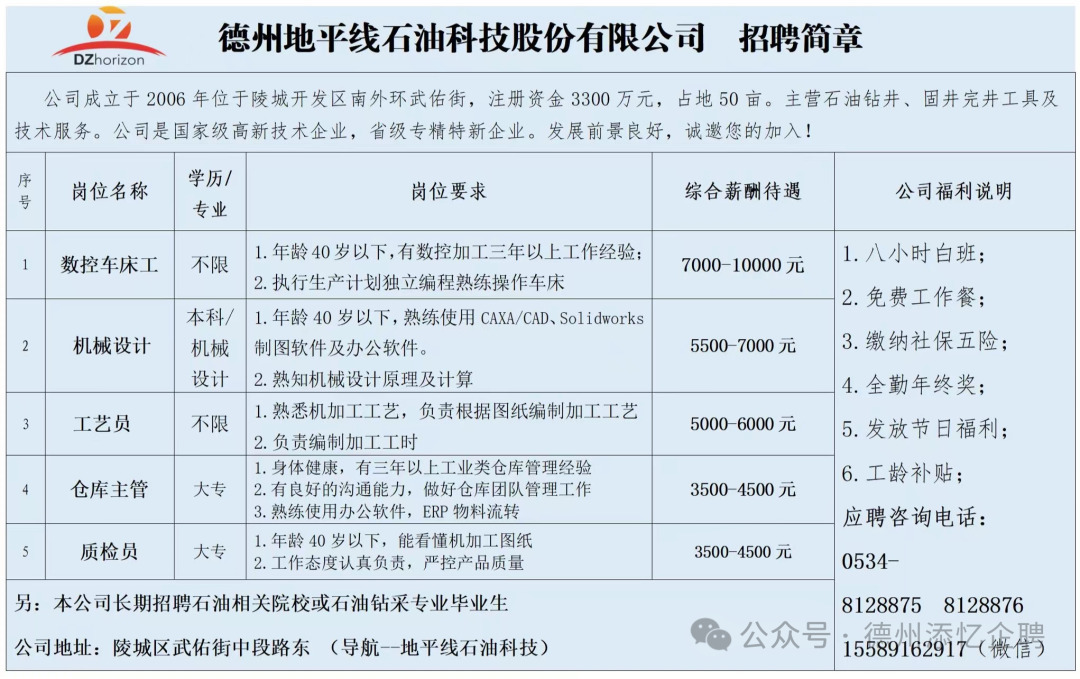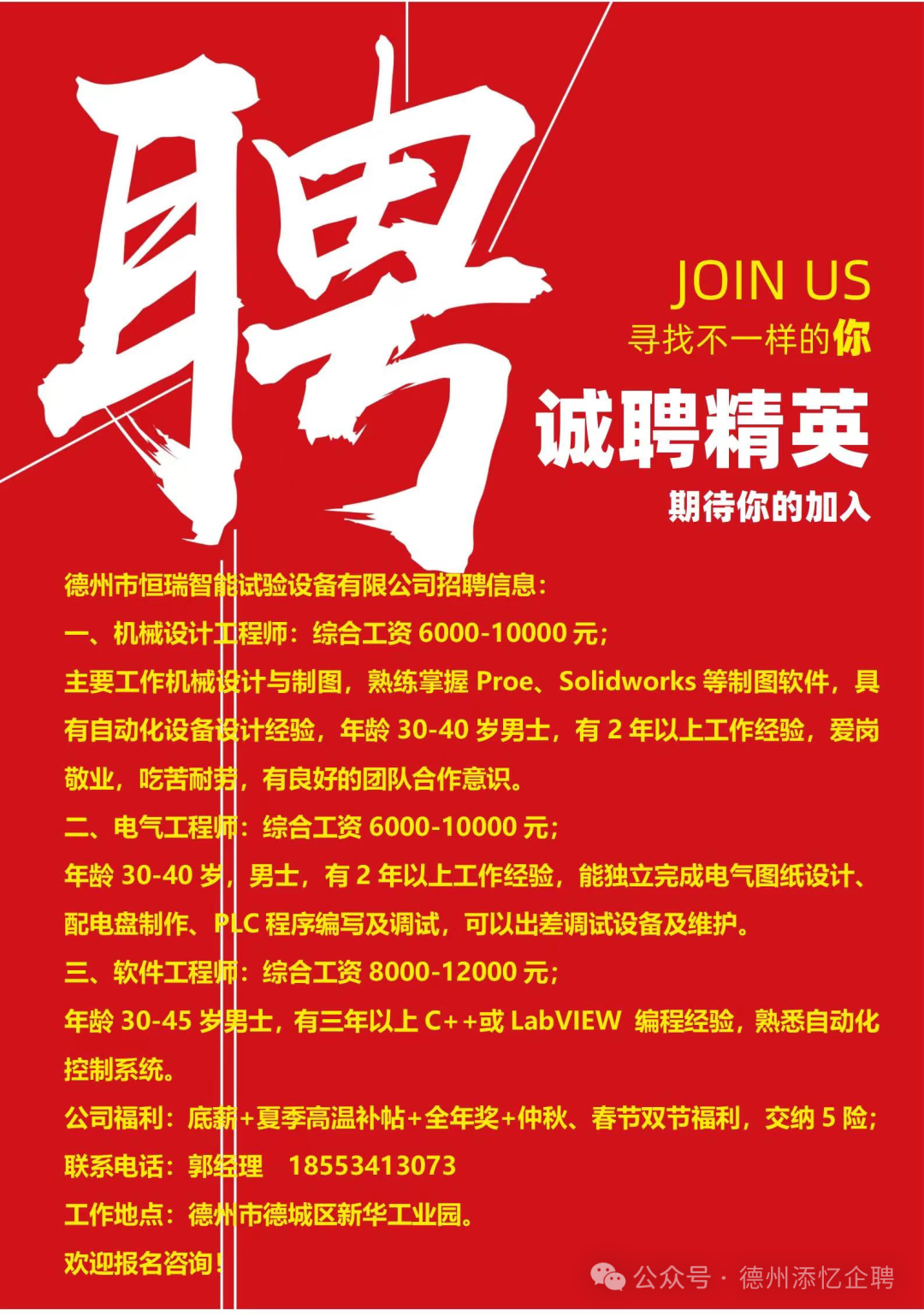店长一名,工资面议。要求:有3年以上日料行业从业经验,两年以上餐饮门店管理经验。管吃管住。1.有加工中心、数控车床操作经验,能独立手工编程。福利:五险一金/免费住宿/免费就餐/工龄奖/节日福利/生日福利公司地址:山东省德州市运河经济开发区天衢东路5188号 (边临镇)兼职焊工两人:焊接过五金件抽屉;会二保焊,氩弧焊。职位要求:1、熟练掌握西门子及国产主流PLC编程与控制,熟悉DCS、变频器、 低压电器等常用元器件,能独立设计、调试及测试控制程序;暖通专业优先。● 外贸经理1名、外贸专员 2名 薪资:月薪10K+;4-6k+职位要求:1、熟悉进出口业务流程,熟悉外贸进出口法律条规,具备贸易管理专业知识和相关技能;2、两年以上工作经验;本科以上学历优先;国际贸易、英语等相关专业。职位要求:1、会识图纸、熟悉工艺流程;2、能独立操作数控车床、工装夹具的更换与设置;3、对设备操作保养熟悉,有品质意识;4、两年以上工作经验,大专以上学历优先;5、男性优先,40以内。● 钳工技师 、装配技师 各 2名 薪资:月薪5K-7K职位要求:1.独立看懂图纸,并完成机械设备的装配;2. 中专以上学历,机械/机电/电气相关专业皆可;3、 动手能力强,能吃苦耐劳、有团队合作精神;4、男性优先,40以内。职位要求:1、负责产品的日常检验,并对检验后的产品进行状态标识;填写相应的检验记录表单;对检验中发生的问题进行处理过程跟踪。2.大专以上学历,机械/机电/电气相关专业皆可。福利:五险一金/免费住宿/免费就餐/工龄奖/节日福利/生日福利电话:19953478188(微信同号) 联系人:杨女士公司地址:山东省德州市运河经济开发区天衢东路5188号 (边临镇)网络销售 专科以上学历 薪资底薪加提成 25-35岁 环境好 五险一金 朝八晚五 包食宿 单休 有年假, 负责公司产品的销售及推广 根据市场营销计划,完成部门销售指标,开拓市场,发展新客户. 招聘车间质检一名:高中以上学历,会看平面图纸及立体图纸!有责任心,勤奋好学。 招聘客房服务员数名,要求:责任心强,有经验,客人退房后及时打扫房间,听从领导安排。月公休4天,工资底薪加提成加全勤,综合薪资3000~5000元,免费工作餐,工作环境温馨,过节福利,年终奖,有经验者优先录用。3、车间普工 按产量计算工资,综合5000元,55周岁以下,限男性要求:全日制大专及以上学历,3年以上工作经验,工资:4000—5000元/月1、【保洁】 1人 要求身体健康,干活利索,55岁左右,8小时工作制,要求女性,待遇面议2、【结构工程师】 2人 要求SolidWorks三维软件及CAD制图软件熟练使用, 待遇从优3、【固态电池工程师】 1人 本科及以上学历,材料、电化学等相关专业,有固态电池研发、技术类2年以上工作经验。薪资面议4、【锂电事业部销售副总】 5人 3年以上团队管理经验,能够带领团队完成部门营销销售任务;有通讯、电力、数据中心、轨道交通等行业锂电销售经验。薪资面议5、【储能系统工程师】 1人 3年以上的储能系统设计和项目管理经验,负责储能系统的技术规划和方案设计,包括系统架构、电气设计、控制设计等,薪资面议1、新媒体主播1名,性格阳光开朗,有汽车销售工作/直播 经验优先考虑 薪资5K-10K。2、网销顾问2名,有销售工作经验,良好沟通表达能力。无责底薪+五险一金+餐补+带薪休假+带薪培训+节假日福利+晋升 地址:德州经济技术开发区广川大道与新河东路交叉口南50米 东风本田汽车4S店2)辅助财务主管开展财务部门的往来、费用、成本、税务等方面财务用关工作。4)具有较强的独立工作能力和学习能力,工作踏实、认真仔细、积极主动;5)具有良好的职业操守和团队合作精神,较强的沟通、理解和分析能力;6)热爱财务工作,且有长期在财务方向发展意愿。福利待遇:单休+五险一金+免费午餐+住房补贴+交通补贴公司地址:德州市天衢新区崇德八大道与大学路交叉口北新旧动能转换产业园。山东迪米特电气因为生产规模扩大,现找招聘: 1、标书制作文员2名,要求:大专毕业,35周岁以下,理解力强,熟练使用办公软件,适应标书加班。有工作经验的优先,欢迎应届毕业生积极报名。标书员实习期在总公司,总公司位于湖滨路与萱惠路交接处(山东诚泰电气设备有限公司)。 2、车间统计一名,年龄35周岁以下,大专毕业,有责任心,服从管理,有经工作经验的优先。以上工作转正缴纳五险。 联系电话2262598 职位要求:专科以上学历,有会计从业资格证书,3年以上工业会计工作经验,有高新技术企业会计从业经验优先考虑。薪资待遇面议。5: 主播新媒体: 1名 💰待遇:底薪加提成,薪资丰厚福利:生日礼物+团建+社保+商业险+带薪休假+工作餐+免费培训🏢地址:德州经济开发区新河路南侧河东大街西侧(奥迪院内)☎️ 联系电话:17515167781(微信同步)要求:女性 年龄35-45 能够掌握简单的办公软件2、机械设计 制图 2名 男女不限 工资4000起(机械行业优先考虑; 有经验者工资面议; 应届毕业生也可考虑)3、质检员 2名 男女不限 工资3500-5000以上工种年龄不超过50岁,有从事机械制造行业者优先录用。招聘❗ 招聘❗ 招聘❗ 山东安捷高科消毒科技有限公司诚聘:1、业务经理5人,要求能适应出差, 22—40周岁,工资8000+,上不封顶,缴纳五险。2、流水线普工10名,计件工资,4000-6000元4、物控员和采购专员各1名,工资3000-3500元公司地址:天衢工业园德兴北大道1618号(德兴乾城路西),联系人李经理,联系