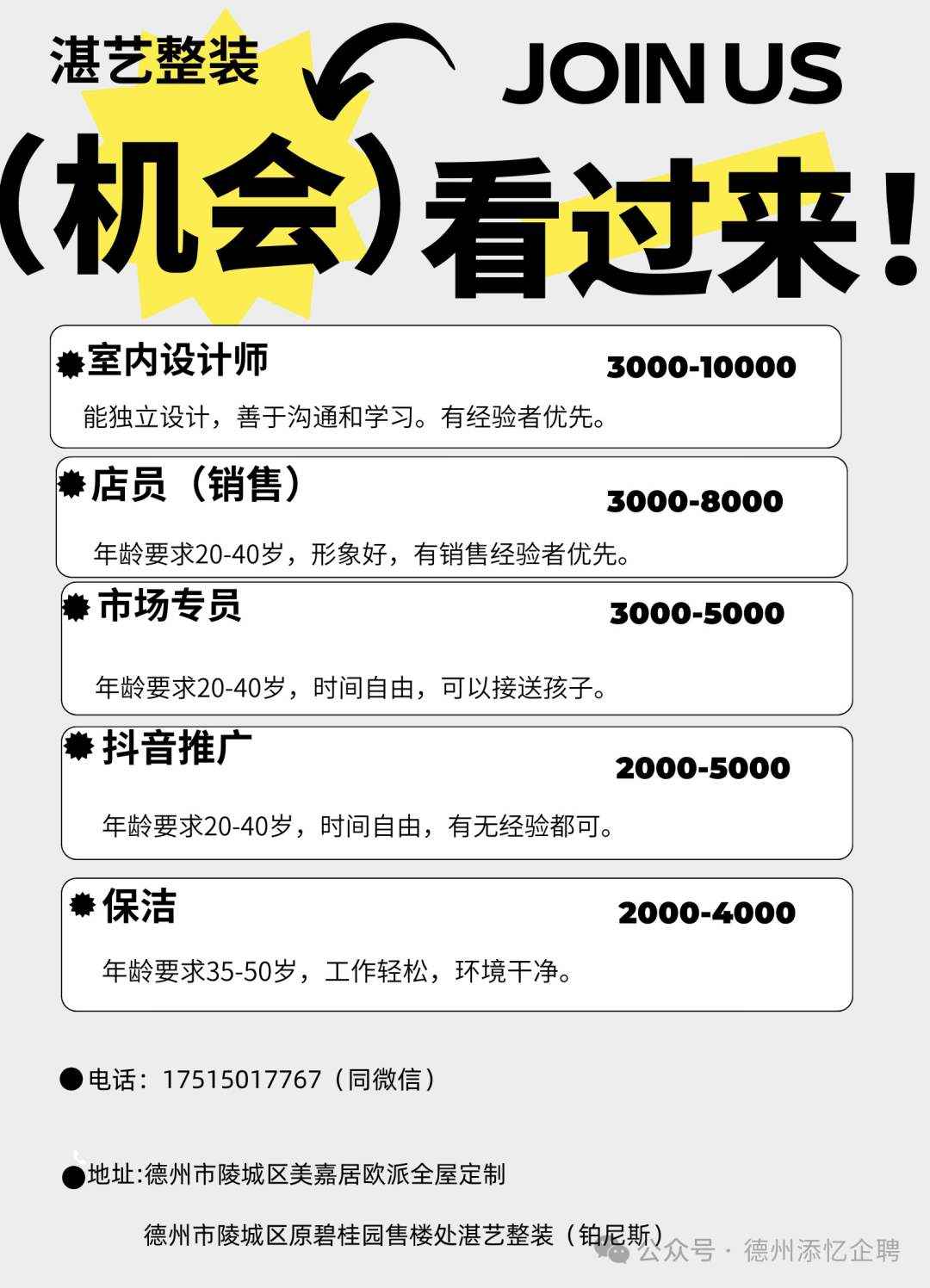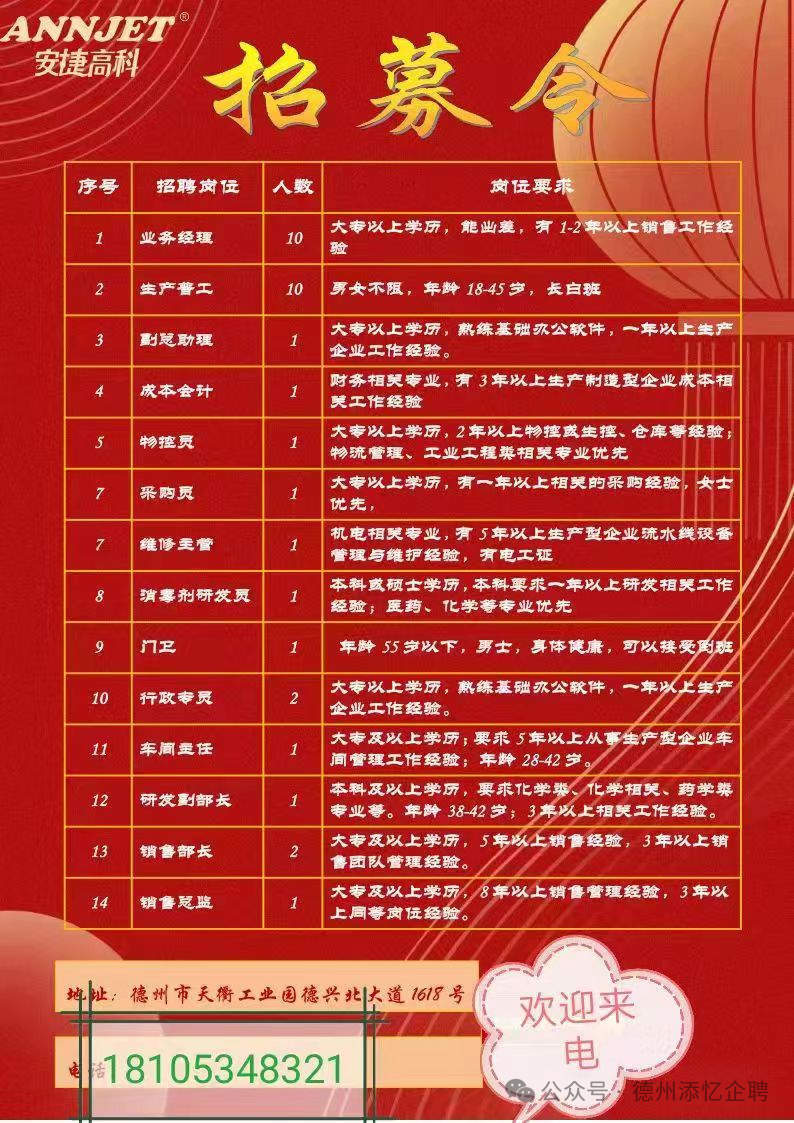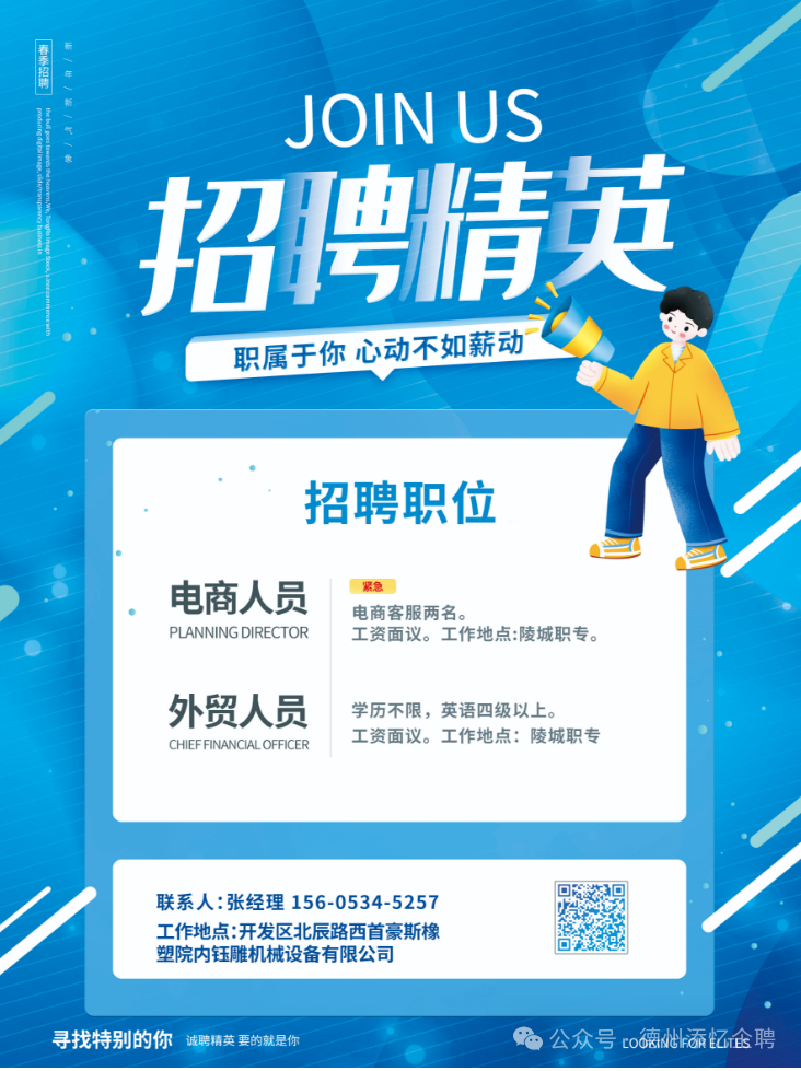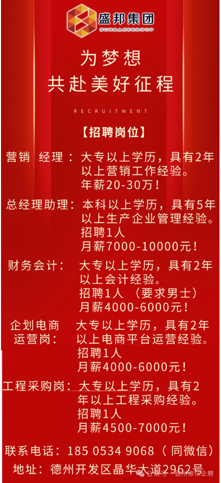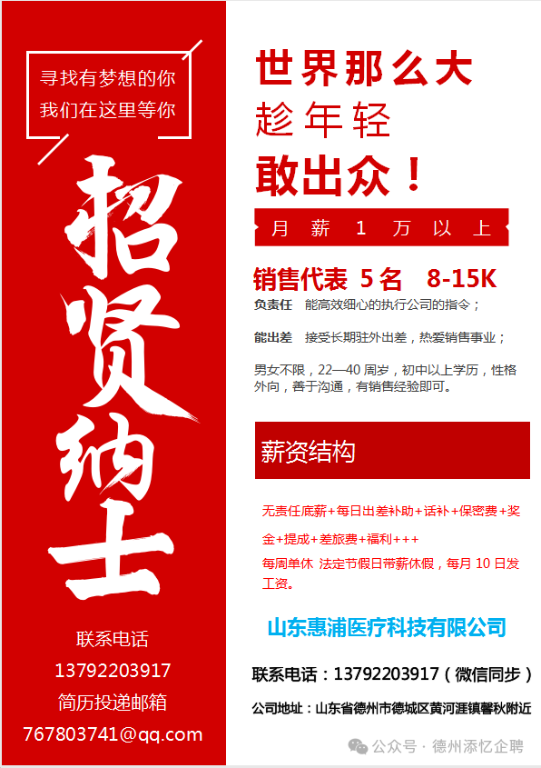 企业直聘信息十五: 1.销售顾问3名,年龄20-40岁,要求有进取心,有团队意识,执行力强,男女不限,有经验者优先,3000-10000➕不封顶 ➕社保。公司地址:德州市经济技术开发区晶华大道宋官屯街道办事处德百汽贸城院内红鼎吉利