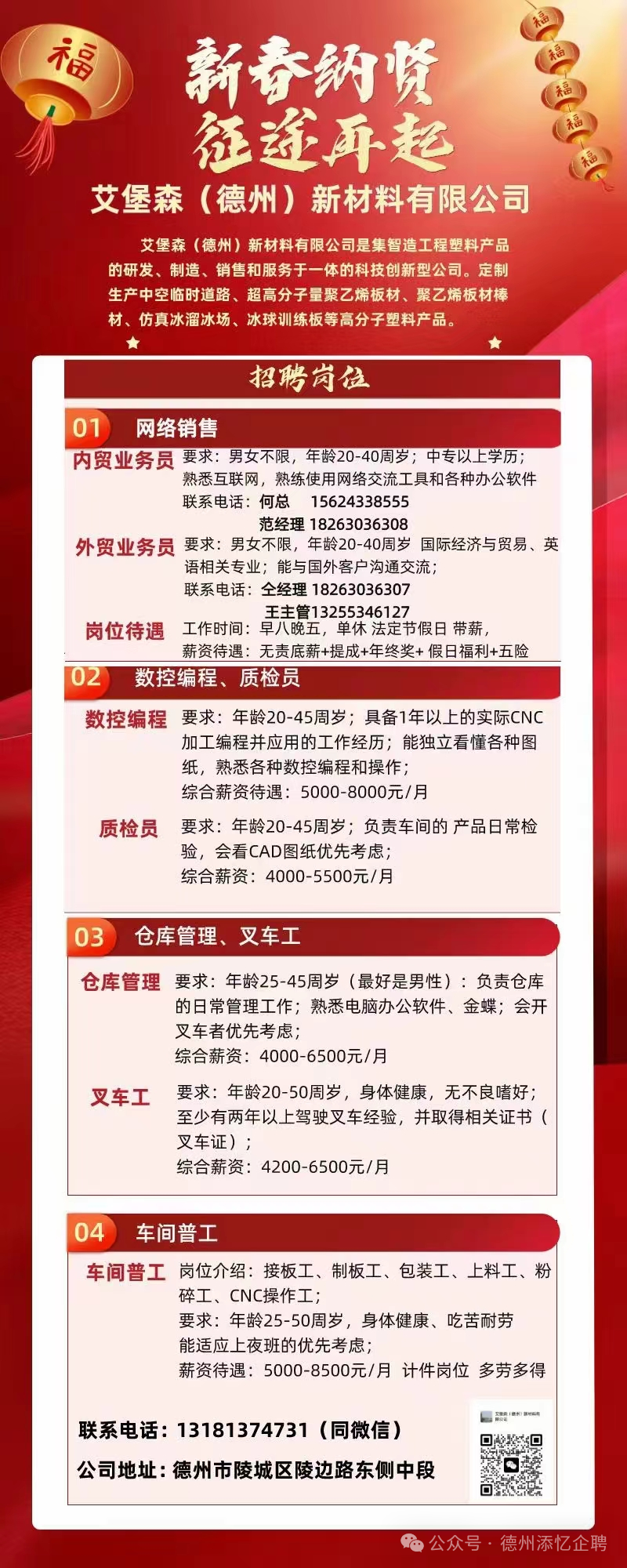 企业直聘信息十八: 4、普工5人,要求:男,20-40岁以下,初中及以上学历,吃苦耐劳,认真负责,工作经验者优先。以上岗位工作时间:一天八小时,缴纳五险;公司提供工作免费午餐、法定节假日,福利多多,每月15日准时发工资;企业直聘信息十九: 主营建材墙板,现因公司业务发展需要,现面向社会诚聘生产操作人员。招聘要求:35-50岁 男,工作认真扎实,具有团队协作意识,有责任心,有经验者优先。工资待遇::试用期男工3600-4000元/月,试用期1个月。转正后视工作能力调整薪酬,在4000-6000元/月之间。免费提供工作餐,缴纳意外险,加班费、团建聚餐、过节福利公司地址:陵城区安德街道银里街道1号(山东黎明纺织有限公司院里)