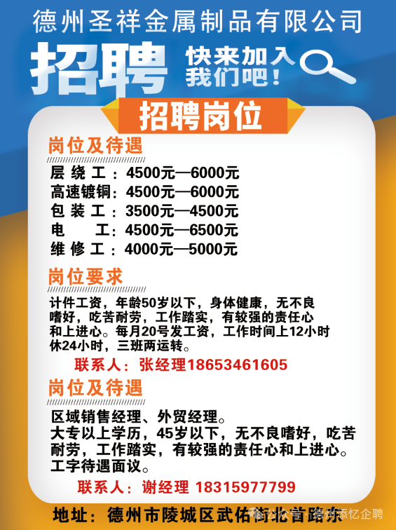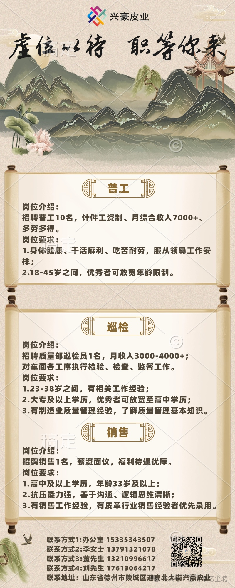 企业直聘信息五: 要求:全日制大专及以上学历,3年以上工作经验,工资:4000—5000元/月企业直聘信息六: 1、待遇:底薪+提成+入职培训+每周单休+五险+每月15日发工资+带薪假期企业直聘信息七: 👉招聘普工10名,巡检员1名,销售1名,具体请点击下方海报查看。