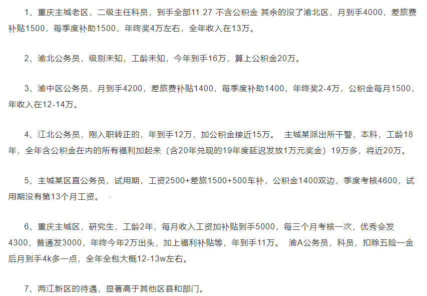 人不是在忙自己的事情,就是在忙别人的事情,看看你自己每天在忙什么,不要瞎忙?回顾一下自己做过的事情,哪些对自己成长有帮助,要求将自己的优势最大化,规避自己的劣势。 重庆,一座融汇山川与现代化高楼的城市,以其独特的地理位置和深厚的文化底蕴吸引着无数游客。但今天,我们不聊旅游,不聊火锅,我们来谈谈这座城市的公务员工资。重庆,虽非如北京上海那般的国际大都市,但作为中国西部地区的经济中心,公务员的薪资待遇自然不会太差。虽然与沿海一线城市相比,重庆的公务员工资或许有所差距,但考虑到城市的整体发展水平,重庆公务员的工资水平仍然位于全国前列,足以体现出这座山城特有的魅力和发展潜力。 在公务员的世界里,薪资待遇往往与地区的经济发展成正比。地区越发达,财政收入越丰厚,公务员的薪资待遇自然也就越高。重庆市作为西部大开发的重要战略支点,其经济发展速度惊人,财政收入稳步增长,这也意味着重庆的公务员在薪资待遇上有着较为优越的条件。这不仅反映在基本工资上,还包括了福利补贴、职务晋升等方面的综合收入,为公务员提供了一个相对舒适的经济环境。 身为公务员,不仅仅是一份工作,更是一种社会地位的象征。在中国,公务员被广泛认为是稳定、有保障的职业,代表着一定的社会地位和尊重。这种身份的认可,不仅体现在工作的稳定性上,更体现在人们对公务员这一群体的普遍尊敬上。虽然公务员的生活节奏可能并不像某些行业那般快速和刺激,但他们所享有的社会尊崇和稳定的生活质量,已足以让许多求职者趋之若鹜。 在浮躁的社会氛围中,减少不必要的社交成为了许多人的选择。而公务员作为一种特殊的职业,他们在工作中往往需要保持一定的公正和中立,这就使得他们在私下里并不怎么社交。这种独特的工作性质,让公务员们更倾向于与家人和密友共度时光,而不是频繁参与应酬和社交活动。这样的生活方式,对于追求宁静和个人空间的人来说,无疑具有很大的吸引力。 作为中国人口最多的城市之一,重庆的经济总量稳居全国前列,这决定了当地人们能找到的工作种类和薪酬水平。在我的朋友圈里,选择在重庆就业的朋友们,无论是在国企、事业单位还是私企,大都能找到相对匹配的工作岗位。私企的发展也相当迅速,尤其是在金融、科技和制造业等领域,提供了大量的就业机会。工资水平和工龄通常与所在行业的发展程度和个人能力密切相关。通过综合评估,我们可以发现,在重庆这样的城市中,体制内的工作确实有其独特的优势,无论是在薪资待遇上,还是在社会地位和生活质量上。 |