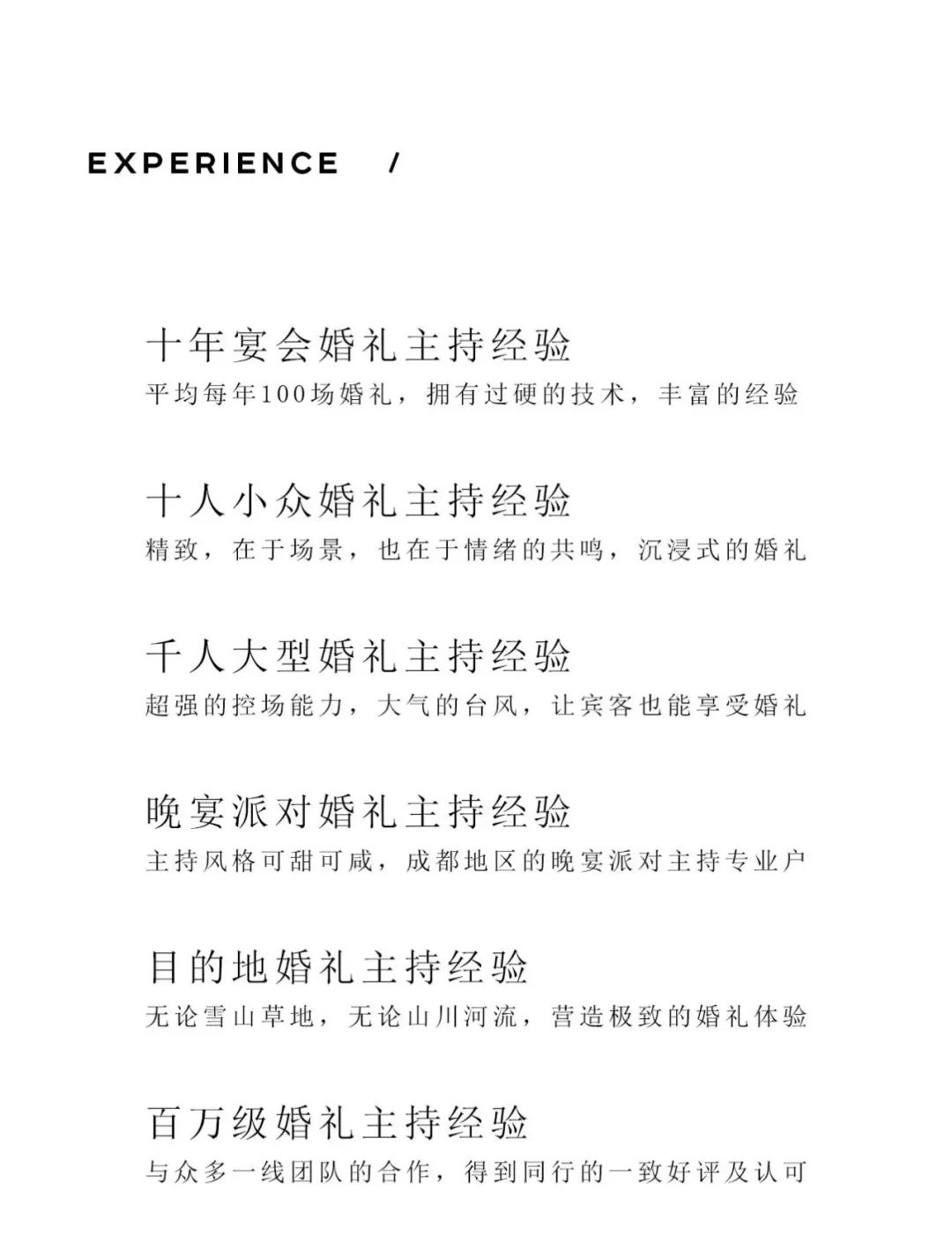 婚礼、商演主持人 ▏流沙 晨艺主持人工作室创始人 和煦如春/春风化雨/返璞归真/自然真诚 WEDDING ◐ Hi,你们好呀! 当你们打开这份资料 我与你们的缘分就此开启 #关于 流沙# About Liusha 身高175cm 全国范围宴会主持人 南充众鑫主持演艺团队联合创始人 沉浸式婚礼美学主持人 宝马汽车、奔驰汽车、哈弗汽车、比亚迪汽车等合作主持 // 资深宴会主持人—何流沙 走自己的路,恰与你相逢 GO YOUR OWN WAY,JUST MEET YOU “用声音解读婚礼,用爱诠释幸福, 只为探寻记忆深处的怦然心动!” HI,你好,我是宴会主持人流沙,从2013年开始踏入于主持行业、凭借磁性的嗓音和走心激情的风格深受新人及业内好评,已经为将近1200对新人提供了优质服务。不管是海外留学归来的成功人士,还是部队归来的兵哥哥亦或是相亲相识较为普通的平凡人、流沙都会以不同的方式去为他们呈现完美的婚礼、因为流沙认为任何一段平凡的爱情都有值得去挖掘的点滴、所以每一场婚礼都会用心以对。不辜负新人的期待。 作品展示 WORK TIME