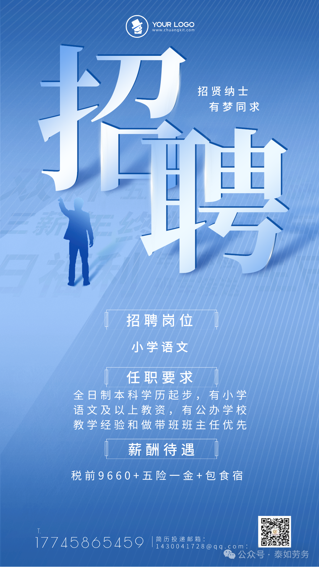 教师岗40周岁以内 全日制本科学历起步 对应科目教资;有学校工作经验。 可随时安排到校面试,面试通过即可到岗 待遇:教育局公办学校统一标准,五险一金,学校高福利,学校提供食堂,部分岗位包食宿 联系人 白老师 rszy20152015 (微信) 简历发至邮箱1430041728@qq.com(内容包含:简历及教师资格证/岗位资格证、毕业证、学位证)