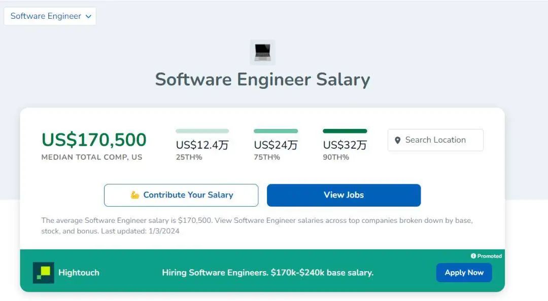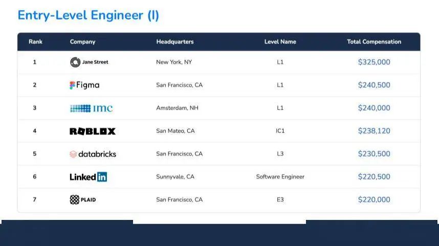 ![]() Levels.fyi发布《2023 End of Year Pay Report》,该报告据称基于20万份程序员薪资数据,主要反映程序员2023年薪酬总额中位数,其中包含工资、股票价值和奖金。 来看看最关注的初级Software Development Engineer薪资排行。 提到SDE首先想到的就是一线大厂,让我们看看数据: ![]() 在榜单列出的Top7中,量化交易公司Jane Street以年薪$325k高居首位,断层碾压一众科技公司。 第2-7名全是二线科技公司,而我们熟知的硅谷五巨头MAMAA(Meta、Alphabet(Google母公司)、Microsoft、Apple、Amazon)无一入榜。 一线大厂,真实薪资水平,根据Levels.fyi所计算出的初级SDE薪资中位数$175,000,一线科技大厂的薪资水平到底是怎样的呢? ![]() Netflix一马当先初级工程师219,458美元的年薪,Google以183,447美元紧随其后,Meta则以196,546美元位居其后,苹果、微软均未达到中位数。 ![]() ![]() ![]() ![]() 看完Levels.fyi薪资盘点,难怪越来越多人想转码卷进大厂当程序员,无论是New Grad还是有个大厂梦、“半路转码”,不可避免谈到“刷题”,想必大家都有一段段在题海苦苦挣扎的故事。 内容综合自网络。本文版权归属作者和原载媒体所有。 |
