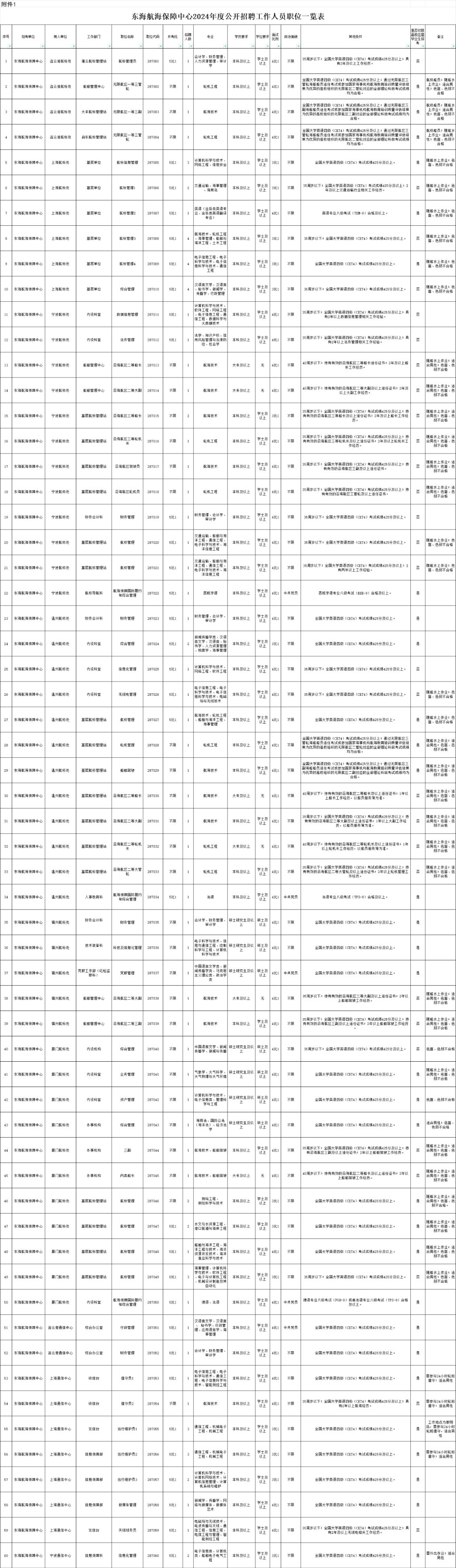 - 招聘公告 - 为满足事业发展需要,东海航海保障中心决定面向社会公开招聘108名事业编制工作人员。参加本次招聘的单位均为中央机构编制委员会办公室批准成立的公益一类事业单位,主要承担海事航标建设养护、港口航道测量绘图、水上安全通信等技术支持和服务保障职责。现就招聘有关事项公告如下: 一、报考条件 (一)具有中华人民共和国国籍; (二)遵守中华人民共和国宪法、法律和行政法规; (三)具有良好的道德品行; (四)符合招聘职位所要求的各项资格条件; (五)适应招聘职位要求的身体条件; (六)年满18周岁,且年龄不超过职位要求的上限。具体为:35周岁以下的职位仅限1989年1月1日至2005年12月31日期间出生的人员报考;40周岁以下的职位仅限1984年1月1日至2005年12月31日期间出生的人员报考。 对于仅限高校应届毕业生报考的职位,年龄要求统一为:本科生1998年1月1日至2005年12月31日期间出生;硕士研究生1994年1月1日至2005年12月31日期间出生;博士研究生1989年1月1日至2005年12月31日期间出生。 此次招聘,下列人员不得报考: 1.因犯罪受过刑事处罚的人员; 2.被开除中国共产党党籍的人员; 3.被开除公职的人员; 4.被依法列为失信联合惩戒对象的人员; 5.在各级公职人员招考中被认定有舞弊等严重违反考试录(聘)用纪律行为的人员; 6.被辞退公职未满5年的人员; 7.受党纪、政务、政纪处分期限未满的人员; 8.涉嫌违纪违法正在接受审查调查尚未作出结论的人员; 9.现役军人; 10.在读的非应届毕业生(指2024年8月1日以后毕业的学生); 11.法律法规规定不得聘为事业单位工作人员的其他情形的人员。 报考人员不得报考聘用后即构成回避关系的职位。 二、报考程序 (一)职位查询。 详见《东海航海保障中心2024年度公开招聘工作人员职位一览表》(附件1)。 (二)网上报名和资格审查。 1.本次招聘采取网络报名的方式进行。报名人员可登录“上海建交人才网”(jjrc.zjw.sh.gov.cn)—“考试认证”栏目—“东海航海保障中心2024年度公开招聘工作人员考试”入口报名。 2.每人仅限报考一个职位,请谨慎申报。 3.报名时间:2024年3月18日9:00至3月26日16:00。不满足笔试开考比的职位改报名时间详见第10条。 4.资格审查时间:2024年3月18日9时至2024年3月28日16时。不满足笔试开考比的职位改报名资格审查时间详见第10条。 5.报名人员应认真阅读招聘公告和报名网站发布的相关信息,详细了解报考职位条件,提前准备电子证件照片(近期免冠彩色正面证件照,照片格式为jpg,图片大小为200KB以内,高度大于等于480像素,宽度大于等于330像素)、学历学位证书、教育部学籍在线验证报告以及职位要求的如英语证书、船员适任证书、船员适任考试成绩单、劳动合同、社保缴费等相关资料的扫描件(以压缩包形式上传,1M以内),按照《网上报名指南》(附件2)规定的步骤进行具体操作。 6.报名人员必须对提交审核的报考信息的真实性负责。资格审查贯穿招聘工作全过程,在各环节发现报考者存在不得报考的情形或者不符合报考资格条件的,招聘单位均可取消其报考资格或者聘用资格。 7.首次登录系统需注册账号,请按照系统要求注册个人账户并牢记密码。 8.按照要求规范填写或选择表项。报考信息通过审核后才能进行报名确认等操作,报名确认完成后方取得笔试资格。 9.报名人员“提交审核”后信息将被锁定,在未反馈审核结果前不能修改。审核结果在报名人员提交报名之后两个工作日之内反馈,报名人员可在2024年3月20日9时至2024年3月28日16时期间登录“上海建交人才网”(jjrc.zjw.sh.gov.cn)—“考试认证”栏目—“东海航海保障中心2024年度公开招聘工作人员考试”查询审核结果。 “审核未通过”的,可在规定报名时间(2024年3月18日9:00至3月26日16:00)内修改报考信息,选择职位重新报考;“审核通过”的,报考信息将不能再修改,也不能再申请改报其他职位。考试报名实行告知承诺制,报名人员应对网上提交的信息和材料负责,如因个人填报信息失真,导致不符合报名条件和职位要求而审核未通过的,一切后果责任自负。 10.本年度部分招聘职位设笔试开考比例,即招聘职位报名资格审核通过人数与计划招聘人数之比不低于5:1,方可按计划进行笔试;未达到规定比例的,经上级部门核准,取消相应职位招考或核减职位计划招聘人数(如招聘1人的职位,需有5人及以上通过资格审核方可开考;招聘3人的职位,若最终只有10到14人通过报名资格审核,则计划招聘人数调减至2人,若最终只有5到9人通过报名资格审核,则计划招聘人数调减至1人,依此类推)。 2024年3月28日16:00后,将对取消招考的职位情况进行公布。对于职位已取消但通过该职位资格审核的考生,请于3月28日16:00至3月29日16:00,再次登录报名系统,重新选择职位进行报名,报名相关要求不变,逾期未改报的,视作放弃改报权。 2024年4月1日,将根据最终报考职位审核通过人数,对未达到规定比例的职位,核减职位计划招聘人数,其中核减职位计划招聘人数至1人的职位,面试比例由3:1调整为4:1,其他不变,并对调整后的公开招聘职位数和报名情况进行公布。 如对报名资格审核结果有异议,请于2024年3月20日9:00至3月28日16:00与东海航海保障中心联系。因职位取消改报名的考生对报名资格审核结果有异议的,请于2024年3月29日9:00至4月1日16:00与东海航海保障中心联系。 (三)报名确认和