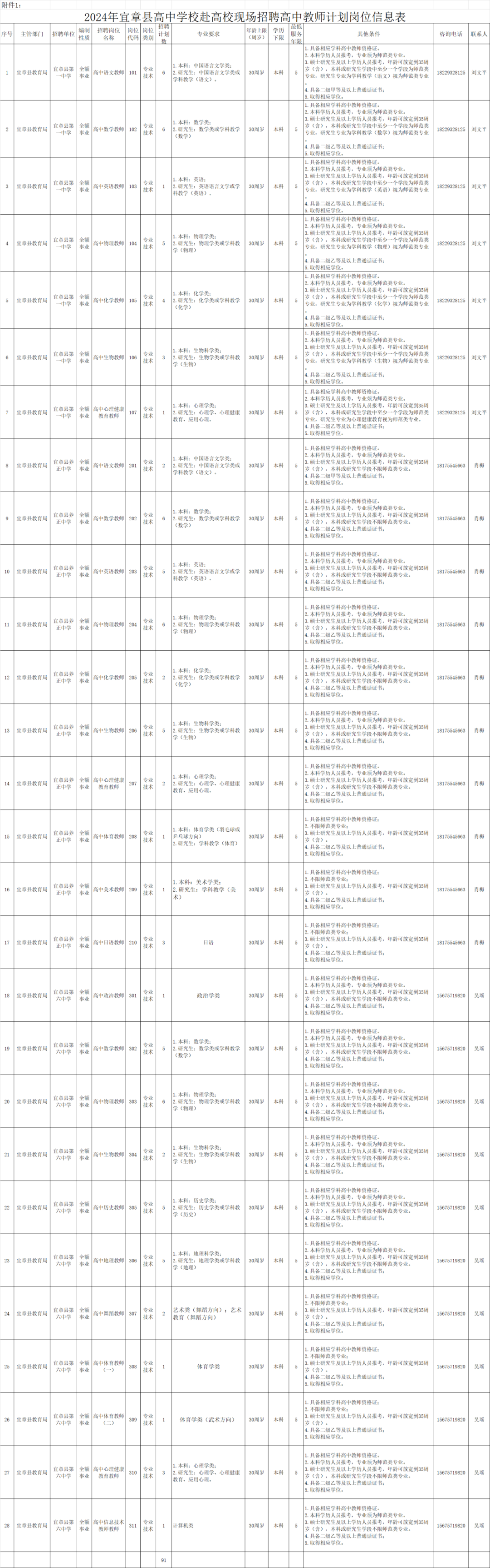 各位郴州的父老乡亲们,大家好,这里是郴州便民信息,一个属于郴州人自己的便民公众号! 根据《事业单位人事管理条例》(国务院令第652号)、《关于印发〈湖南省事业单位公开招聘人员办法〉的通知》(湘人社发〔2019〕1号)、《关于进一步规范我省事业单位公开招聘考试工作的通知》(湘人社发〔2021〕37号)等文件精神,经宜章县委、县政府同意,宜章县高中学校面向普通高等学校本科及以上学历毕业生,公开招聘全额拨款事业单位编制教师91名。现公告如下: 一、招聘计划 1.2024年宜章县高中学校在湖南师范大学设置招聘点,面向高校公开招聘全额拨款事业单位编制教师91名,其中:宜章县第一中学26名、宜章县养正中学33名、宜章县第六中学32名。具体招聘岗位、计划数及资格条件等详见《2024年宜章县高中学校赴高校现场招聘高中教师计划岗位信息表》(附件1)。