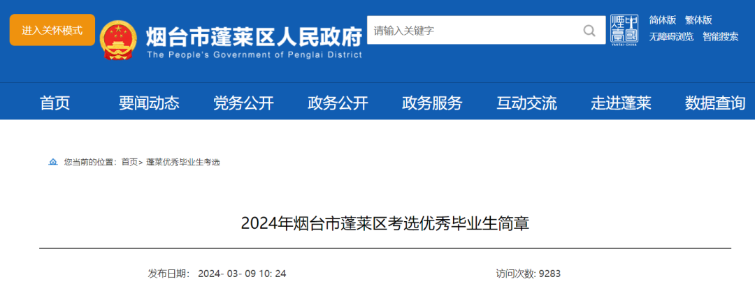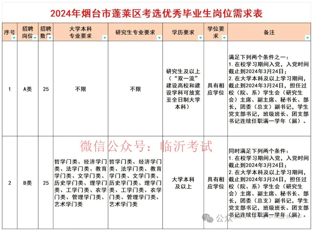 为培养造就高素质专业化干部队伍,按照《事业单位人事管理条例》(国务院令第652号)、《山东省事业单位公开招聘人员实施办法》(鲁人社规〔2022〕2号)等规定,烟台市蓬莱区拟从大学本科及以上学历的优秀高校毕业生(不含定向培养生、委托培养生)中,考选50名优秀毕业生到事业单位工作,进行重点培养。现公告如下: (二)须年满18周岁(2006年3月24日以前出生),其中,大学本科毕业生不超过25周岁(1998年3月24日以后出生),硕士研究生不超过28周岁(1995年3月24日以后出生),博士研究生不超过32周岁(1991年3月24日以后出生);(三)遵守中华人民共和国宪法,拥护中国共产党领导和社会主义制度;(四)具有良好的道德品行和适应岗位的身体条件、心理素质;考选岗位主要参照教育部相关专业学科目录设置专业要求,报考人员学历证书所载专业应与报考岗位专业要求相一致。报考人员在普通全日制高等学历教育阶段取得国家承认的辅修专业证书、双学位证书的,可与相应的毕业证书配合使用,依据辅修专业证书、双学位证书注明的专业报考。除2024年普通高校应届毕业生以及与国(境)内普通高校应届毕业生同期毕业的留学回国人员的学历、学位及相关证书,须在2024年7月31日前取得外,对暂未取得国(境)外学历学位认证的留学回国人员,可采取“承诺+容缺”方式,允许先行参加考试,在考察或体检阶段提供国(境)外学历学位认证书;其他人员报考的,须在2024年3月24日前取得国家承认的学历、学位及相关证书。已经就业或签订就业协议书的毕业生须具有用人管理权限部门或单位出具同意报考证明,无业人员须提交就业创业证或处于无业状态的个人书面承诺书。海归留学人员取得国务院学位委员会和教育部授权教育部留学服务中心出具的国(境)外学历学位认证书后,可报考有相应层次学历学位要求的岗位。教育部办公厅《关于统筹全日制和非全日制研究生管理工作的通知》(教研厅〔2016〕2号)和《教育部办公厅等五部门关于进一步做好非全日制研究生就业工作的通知》(教研厅函〔2019〕1号)规定,自2016年12月1日后录取的非全日制研究生,由国家统一下达招生计划,与全日制研究生考试招生执行相同的政策和标准,培养质量坚持同一要求,学历学位证书具有同等法律地位和相同效力,享有平等就业机会。符合上述规定的,报名时与全日制研究生同等对待。报名采取统一时间网上报名、网上初审、网上缴费的方式进行,每人限报一个岗位。报名网址:烟台市蓬莱区人民政府网站(www.penglai.gov.cn)报名时间:2024年3月24日9:00-3月29日17:00查询时间:2024年3月24日11:00-3月30日17:00报考人员报名前,请仔细阅读本考选简章,确认符合拟报考岗位的条件后再进行网上报名,已经就业或签订就业协议书的毕业生须征得具有用人管理权限部门或单位同意。对报考岗位条件中的专业、学历、资格条件等信息需要咨询时,可拨打咨询电话具体咨询。报考人员登录指定的报名网站,按要求如实填写、提交个人信息资料,同时上传本人近期1寸免冠正面彩色照片(照片大小114x156像素,占用空间小于20K)、用人单位同意报考证明(可参考附件4)彩色扫描件。报考信息经初审通过后,不能更改。2024年3月30日17:00后,考选主管机关尚未初审或者初审未通过的,不能再改报其他岗位,不能再修改、补充报名信息。报考人员必须使用有效身份证件进行报名和考试,报考人员填报的姓名、身份证号码等个人信息必须与证件一致。有恶意注册报名信息、扰乱报名秩序或者伪造学历学位证明及其他有关证件骗取考试资格等行为的,查实后取消其本次报考资格。报考人员在报考期间的表现,将作为公开考选考察的重要内容之一。初审时间:2024年3月24日11:00—3月30日17:00考选主管机关在规定时间内,根据报考人员网上提交的信息及资料,对报考人员进行资格初审,并在网上反馈初审结果。对因不符合报考条件未通过初审的应说明理由,未按规定填报的应予以说明理由并退回报考人员补充。报考人员在网上提交报考信息后,务必及时查询资格初审结果,按反馈抓紧修改完善报考信息,如有疑问请主动联系考选主管机关。缴费时间:2024年3月24日11:00—3月31日12:00通过资格初审的人员,在规定时间内登录报名系统进行网上缴费,逾期未进行网上缴费的,视为放弃。报名成功后,不再退费。缴费成功后于2024年4月15日9:00至笔试前登录报名系统打印准考证、《2024年烟台市蓬莱区考选优秀毕业生报名登记表》和《诚信承诺书》(参加现场资格审查时使用)。按照鲁发改成本〔2022〕55号文件规定,报考人员缴纳笔试考务费每人每科40元。拟享受减免考务费用的最低生活保障家庭人员、脱贫享受政策人口和防止返贫监测帮扶对象,在报名平台完成报名信息填报并通过资格初审后,先进行缴费,4月1日17:00前联系考选主管机关提交减免考务费相关材料,经审核通过后办理退费,逾期不再办理。减免考务费所需材料:1.最低生活保障家庭人员凭其家庭所在地的县(市、区)民政部门出具的享受最低生活保障的证明或低保证,脱贫享受政策人口和防止返贫监测帮扶对象凭其家庭所在地的县(市、区)乡村振兴部门出具的有关证明;2.本人有效居民身份证。报名结束后,最终报考人数达不到计划招考人数3倍的,按照1:3比例相应核减考选计划。A类岗位取消或核减的招聘计划全部调整到B类岗