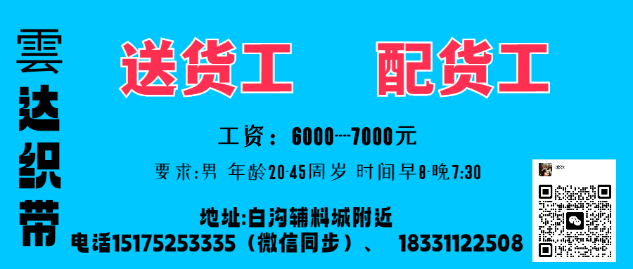 《PP拉杆箱厂》招聘 糊里布 大轴 驻车 穿拉头 质检 《PP拉杆箱厂》招聘 (日结)包厂招聘 高车 平车 台面 剪线 (日结)包厂招聘 网店招聘拿货员 网店招聘 拿货员 网店招聘 淘宝美工 网店招聘 淘宝美工 颗粒塑料厂 招聘 粉碎工 颗粒塑料厂 招聘 粉碎工(无技术含量) 货场招聘 装卸工 女工 工厂招聘会计 工厂 招聘 会计 应聘时请说是在“白沟招聘平台公众号”看到的 百货店招聘送货工 百货店 招聘 送货工 毛绒玩具厂招聘 打包工 质检配货 毛绒玩具厂招聘 服饰广场 招聘 女装销售 服饰广场 招聘 女装销售2名 生鲜超市招聘 店长 经理 兴泉烁皮革 招聘 普工 兴泉烁皮革 招聘 普工 同仁堂招聘 中药调剂 推拿师 中医 北京同仁堂白沟药店招聘 (全职 兼职) 招聘助教老师 银豆豆信息技术招聘 电商专员 客服 运营 河北银豆豆信息技术服务有限公司现诚聘: 网店招聘 客服 配货工 网店 招聘 五金店 招聘 配货员 鑫玉五金店 招聘 配货员 5名 招聘 洗车工 学徒工 招聘 小时工 (五险一金)隆泰物业招聘 经理 客服 主管 技工 队长 绿化工 隆泰物业 招聘 【转让】母婴店转让 【转让】母婴店转让 拉链厂招聘 贴膜工 打码工 封油工 普工 宝硕拉链厂招聘 招聘 日结小时工 送货工 招聘 日结 小时工 蝎子招聘凉菜工 服务员 洗碗工 配菜 做饭大姨 (含小时工)蒙澳烤羊腿 招聘 主管 洗碗工 服务员 蒙澳烤羊腿 招聘 拉链厂 招聘 看机工 拉链厂 招聘 车间操作工 多名 应聘时请说:是在“白沟招聘平台公众号”看到的 快递公司招聘 司机 跟车装卸工 快递公司招聘 应聘时请说:是在“白沟招聘平台公众号”看到的 皮革门店 招聘 送货工 业务员 收银 皮革门店招工 泗庄招聘 种植工人 提供免费技术培训,无经验上岗,计件工资,多劳多得! 要求:吃苦耐劳,有责任心,年龄65周岁以下男女均可。 报名微/电话:18132591335 工作地点:高碑店市泗庄镇 诚聘:男库房打包配货送货工 祝视眼睛招聘 仓库文员 主管 文员 店员 祝视眼镜招聘 玩具厂招聘 缝纫工 客服 会计 毛绒玩具厂招聘 盛通教育招聘 校长 编程老师 销售顾问 盛通教育白沟VipCode少儿编程招聘 网点招聘 拍图 传图 网店招聘 招聘女包主播 抖音服务商 网店招聘 传图 拍图 百信织带招聘 店员 送货工 百信织带招聘 进出口贸易招聘 业务员 会计 文员 应聘时请说:是在“白沟招聘平台公众号”看到的 和道招聘 销售 和道国际三楼 休闲布包 招聘 店员销售 火烧店招聘勤杂工 招聘打包配货工 文诺毛绒玩具 招聘 打包配货工 2-5名 招聘油边工 白沟互惠油边 招聘 油边工 PP拉链厂招聘 水饺馄饨招聘 煮饺子工 包饺子工 御今念水饺馄饨 拉杆箱厂招聘 剪线 打包 糊布 蹬大轴 1、剪线头打包人员 2、糊布工 3、蹬大轴上包 工作简单 计件多劳多得 地址:茫茫口 电话15097786885 男包厂招聘 高车 平车 台面 杂工 男包工厂直聘 鑫园箱包面料招聘 库管 文员 做饭女工 土菜馆招聘服务员 门脸房出租 门脸房出租 小火锅店招聘 服务员 后厨 夜班 串生先回转小火锅诚聘 快递之家 招聘 收件员 快递之家 招聘 收件员 裁海绵纸厂招聘 主管 铺料工 看机工 普工 KTV招聘 前台 营销经理 服务生 Ktv招聘 应聘时请说:是在“白沟招聘平台公众号”看到的 汽车美容店招聘 洗车工 汽车美容学徒 爱车俱乐部汽车美容店招聘 工厂招聘 看机器人员 工厂招聘 看机器人员 刺绣厂招聘 绣花工 裁剪 激光下料 应聘时请说:是在“白沟招聘平台公众号”看到的 酒店招聘 前台 客房 工程 保洁 全季酒店招聘 网店招聘 打包发货 会计 主播 做饭 文员 网店招聘 汽修厂招聘 大工 中工 学员 洗车工 海阔汽修招聘 网供招聘 客服 前台 网供招聘 1、前台 2名 2、客服 2名 要求:办事认真 有责任心 要长期工 熟悉电脑、手机操作 时间:早9晚8点左右 午休1小时 薪资待遇 5000-6000 全勤200 有能力工资可谈 地址:弘康路 电话17713266232 招聘 主播 助理 3、直播运营 4、后台客服 天顺拉链招聘 送货工 配货工 天顺拉链招聘 壹米滴答物流诚聘 小时工 客服 司机 招聘 丝网印花工 招聘 丝网印花 学徒工 熟练工 应聘时请说:是在“白沟招聘平台公众号”看到的 太平洋保险招聘 业务主管 文员 (国企单位)中国太平洋财险白沟支公司 鼎盛箱配招聘 吸塑工 据边工 捡板工 司机 零工 铝框工 鼎盛箱配招聘 毛绒玩具电商招聘 客服 打包 分拣 经理 打版师 毛绒玩具电商招聘 零食店招聘 营业员 店长 (日结)招聘削边工 打鸡眼工 招聘 销售客服 业务经理 会计 打包工 (包吃住)鑫越新材料招聘 搬运工 普工 机长 机修 电工 麻辣香锅店 招聘 后厨帮厨 麻辣香锅店 招聘 后厨帮厨 2名 益多科技招聘 文员 销售 会计 司机 库管 厨师 益多科技招聘 老螺王螺蛳粉 招聘 店员 老螺王螺蛳粉 招聘 店员 若干 招聘绗绣工 招聘复合工 招 绗绣熟练工 串串香招聘 洗碗 勤杂 后厨 服务员 应聘时请说:是在“白沟招聘平台公众号”看到的 招聘 保洁 保安 白沟热力公司 招聘 1、保洁 3名 应聘时请说:是在“白沟招聘平台公众号”看到的 复合厂招聘普工 工作简单 身体健康 有责任心 吃苦耐劳的 工资:5000-8000元 工资月结 师傅优先。 电话:15832290399 地址:东李家营村 老四粮油招聘 送货工 业务员 玩具厂招聘打包工 网供招供货商 我出样品,你做货!价格合适 诚信为本,合作共赢,期待你的合作 电话:19833917436 古董古玩 诚聘 业务