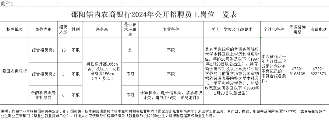 二、招聘条件 (一)基本条件1.具有良好的政治素质和道德品行,诚实守信,遵纪守法; 2.具有符合招聘岗位要求的工作能力; 3.具有较强的责任心、学习沟通能力和团队合作精神; 4.具有正常履行职责的身体条件和健康良好的身体素质; 5.符合金融监管部门关于银行从业人员有关要求; 6.农商银行在职员工的配偶、子女及其配偶、兄弟姐妹(含配偶的兄弟姐妹)及其配偶、兄弟姐妹(含配偶的兄弟姐妹)的子女及其配偶,不得报考该农商银行。 (二)学历及年龄条件公招员工应具有国家统招的普通高等院校大学本科及以上学历和相应学位,年龄26周岁及以下(1997年2月28日以后出生);具有硕士研究生及以上学历和相应学位的(前置学历符合国家统招的普通高等院校大学本科及以上学历和相应学位),年龄放宽至30周岁及以下(1993年2月28日以后出生)。留学人员应取得教育部留学服务中心的学历学位认证,2024届毕业生必须在2024年10月31日前取得学历认证,在规定时间内未取得学历认证的,不予录用。 (三)其他条件1.各行可根据工作需要自行制定个性化条件,详见附件1。 2.考生具有两个层次学历的,有一个专业符合要求即可;具有双学位的,其中一个学位所学专业符合要求即可。 ![]() 3.实行最低服务年限规定,新招员工最低服务年限不得低于4年。 (四)有下列情形之一的人员不得报考1.因犯罪受过刑事处罚的; 2.被开除中国共产党党籍、开除公职的; 3.涉嫌违法犯罪正在接受司法调查尚未作出结论的; 4.尚未解除党纪、政务(政纪)处分,或正在接受纪律审查的; 5.被发现在公务员、事业单位及湖南农信系统等各级各类单位公开招考中有舞弊等严重违反招聘纪律行为的人员; 6.本人及父母、配偶在湖南农信系统有自借不良贷款未归还或被列入失信联合惩戒对象的(含失信被执行人); 7.湖南农信系统正式员工在与原单位解除劳动合同前不得报考其他农商银行。 8.法律、政策规定不得报考的其他情形。 三、招聘程序 公开招聘员工按发布公告、报名、资格审查、笔试、面试、考察、体检、公示、录用、补录等程序进行。公开招聘员工按岗位分别划线、分别录取。 (一)发布公告。在第三方专业机构招聘网发布招聘公告。公告发布时间:2024年3月8日至2024年3月19日。 (二)报名。网上报名时间定为2024年3月11日至3月19日。资格审核时间:2024年3月11日至2024年3月19日24:00 报名网站: 邵阳农村商业银行股份有限公司:https://synsyhzp.zhaopin.com 湖南邵东农村商业银行股份有限公司:https://sdnsyhzp.zhaopin.com 湖南新邵农村商业银行股份有限公司:https://xsnsyhzp.zhaopin.com 湖南邵阳昭阳农村商业银行股份有限公司:https://syzynsyhzp.zhaopin.com 湖南隆回农村商业银行股份有限公司:https://lhnsyhzp.zhaopin.com ![]() 湖南洞口农村商业银行股份有限公司:https://dknsyhzp.zhaopin.com 湖南武冈农村商业银行股份有限公司:https://wgnsyhzp.zhaopin.com 湖南新宁农村商业银行股份有限公司:https://xnnsyhzp.zhaopin.com 湖南绥宁农村商业银行股份有限公司:https://snnsyhzp.zhaopin.com 湖南城步农村商业银行股份有限公司:https://cbnsyhzp.zhaopin.com 考生自行在网上报名系统注册进行报名申请,报名信息必须填写完整,若有信息遗漏或缺失,视为无效。并按要求上传清晰的身份证正反面、毕业证、学位证及学历认证等有关材料。国(境)内学历应届生需上传“教育部学籍在线验证报告”、国(境)内学历往届生需上传“教育部学历证书电子注册备案表”、“中国高等教育学位在线验证报告”、国(境)外学历应届生需上传学校出具的在校证明、国(境)外学历往届生需上传教育部留学服务中心出具的“国(境)外学历学位认证书”。考生只能选择一家农商银行一个岗位报名,不能多头报名。 (三)资格审查。根据考生提交的基本信息和上传的有关资料,择优甄选参加笔试人员。考生可登陆报名网站查询资格审查结果。网上初审通过的报名成功,不能再修改报名信息和报考岗位;网上初审不通过的,报考人员初审时间截止前修改报名信息补齐资料,否则视为考生自行放弃报考。审核结果不再另行通知。 资格审查贯穿招聘工作全过程,任何环节发现报考人员不符合招聘条件或提供的材料弄虚作假的,一经查实,取消考试或录用资格。 (四)笔试。招聘最低开考人数为5人,在此基础上每增加一名招聘计划按1:3确定开考比例,达不到开考比例的适当调剂、递减或取消相应岗位招聘计划。 笔试设置最低合格分数线,未达到合格分数线的报考人员不能入围面试。 笔试时间定于2024年3月22日。准考证打印时间为2024年3月21日24:00止。笔试具体时间、地点以准考证载明的信息为准。 (五)面试。面试时间初定于2024年3月24日。面试的最低开考人数为3人,开考人数以参加笔试且成绩有效人数统计,以后每增加一名招聘计划按不低于1:2确定开考比例,达不到开考比例的适当核减或取消招聘计划。 面试的具体时间、地点,招聘工作组将以电话或短信形式通知。面试前需要对报考岗位所需要的资料进行现场审核,审核符合条件的考生,方可进入考场面试。 (六)考察。考察对象按报考人员的考试综合成绩从高分到低分等额确定入围考察人选;综合成绩相同的,按笔试成绩排名确定入围考察人选。考察内容主要包括报考人员的思想政治表现、遵纪守法、道德品质、业务能力、工作实际、资格条件等方面情况。 (