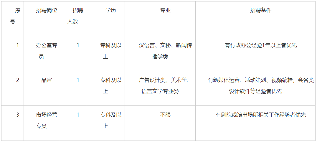 温州市白鹿文化演艺发展有限公司(以下简称白鹿演艺公司)系鹿城区人民政府直属的国有企业温州市鹿城区文旅传媒集团有限公司全资子公司,现因公司工作需要,决定面向社会公开招聘工作人员3名,主要负责办公室工作,有关要求如下: 一、招聘对象基本条件 1、拥护中国共产党的领导,具有良好的品行,无违法违纪记录。 2、身体健康,爱岗敬业,具有一定的实际工作能力,有较强的事业心和责任感。 3、熟练掌握office及其他办公软件操作,具有较强的沟通表达能力和团队合作精神。 4、年龄在35周岁以下,特别优秀者(如具有相应工作经验5年以上或相应岗位中级以上职称),年龄限制可放宽至40周岁。 二、招聘岗位及要求