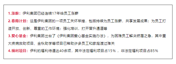 伊利集团的福利体系尤为健全且个性化,除了正规的五险一金之外,还推出了“春雨计划”,旨在通过持续涨薪、提供开放创新的工作环境和完善的职业培训体系,共享企业的发展成果。 同时,伊利还设立爱心基金,为面临困难的员工提供及时援助,如重大疾病救助和金秋助学项目等。伊利的福利待遇项目多达40余项,其中非法定福利占比达到85%,充分展现了企业的人文关怀。 【伊利晋升机会与工作节奏】 在晋升机会方面,伊利为员工构建了明确的职业发展路径。如销售代表可以通过努力晋升至城市经理、区域经理乃至大区经理,而管培生则享有优先晋升的机会。 尽管晋升竞争激烈,但员工普遍反映机会较多,关键是个人能力和表现。 在工作节奏上,伊利各岗位间存在差异。部分岗位如行政、人力等部门,员工能基本做到准时上下班,周末无需加班;而销售、生产等前线岗位则时常面临加班压力,尤其是节假日和销售旺季。 尽管存在加班情况,但伊利在工作时间安排上尽量做到了人性化,且对加班并无补贴政策。 【年终奖与工作压力】 关于年终奖,伊利集团遵循绩效导向原则,只有在完成年度任务的前提下,员工才能获得年终奖,通常在春节前发放,金额根据个人表现浮动。 有员工反馈年终奖在两万元左右,但具体数额取决于任务完成程度和是否存在罚款等情况。 在工作压力方面,员工的反馈呈现出多元化特点。 一方面,员工赞赏伊利作为大型企业的稳定性与规范性,认为公司为员工提供了较好的职业成长平台;另一方面,部分员工指出销售和生产岗位的工作压力相对较大,尤其是在旺季和节假日,加班频繁且缺乏加班补贴,但这也体现了伊利为适应市场需求所做的不懈努力。 总之,伊利集团凭借其优秀的品牌价值、健全的薪酬福利制度、丰富的晋升机会以及因岗位而异的工作压力和节奏,为员工创造了多元且富有挑战性的工作环境。 尽管在加班补贴等方面仍有待完善,但其整体的企业文化和管理体系充分体现了对员工权益的尊重与呵护,为企业持续吸引和留住优秀人才奠定了坚实基础。 |