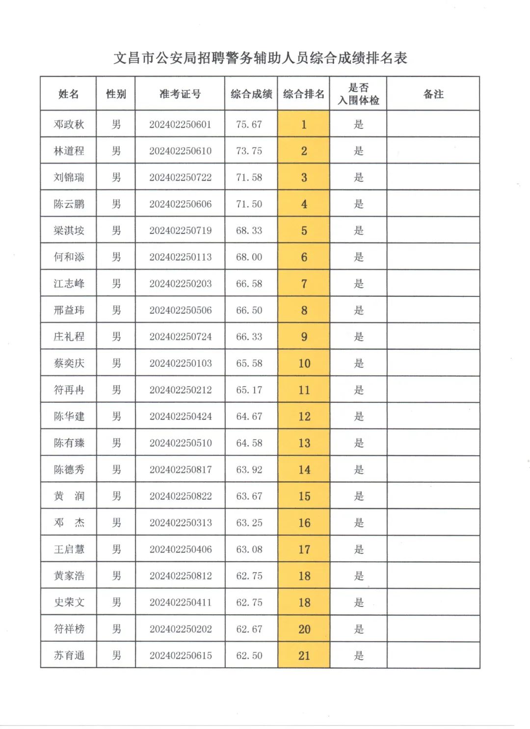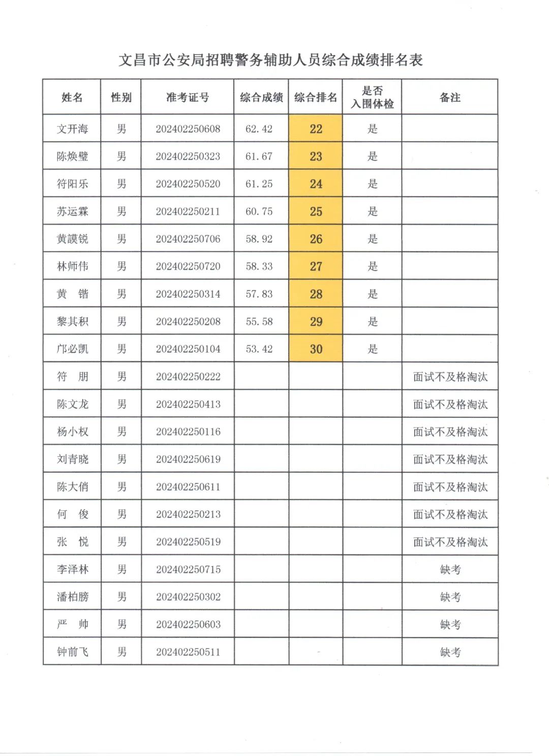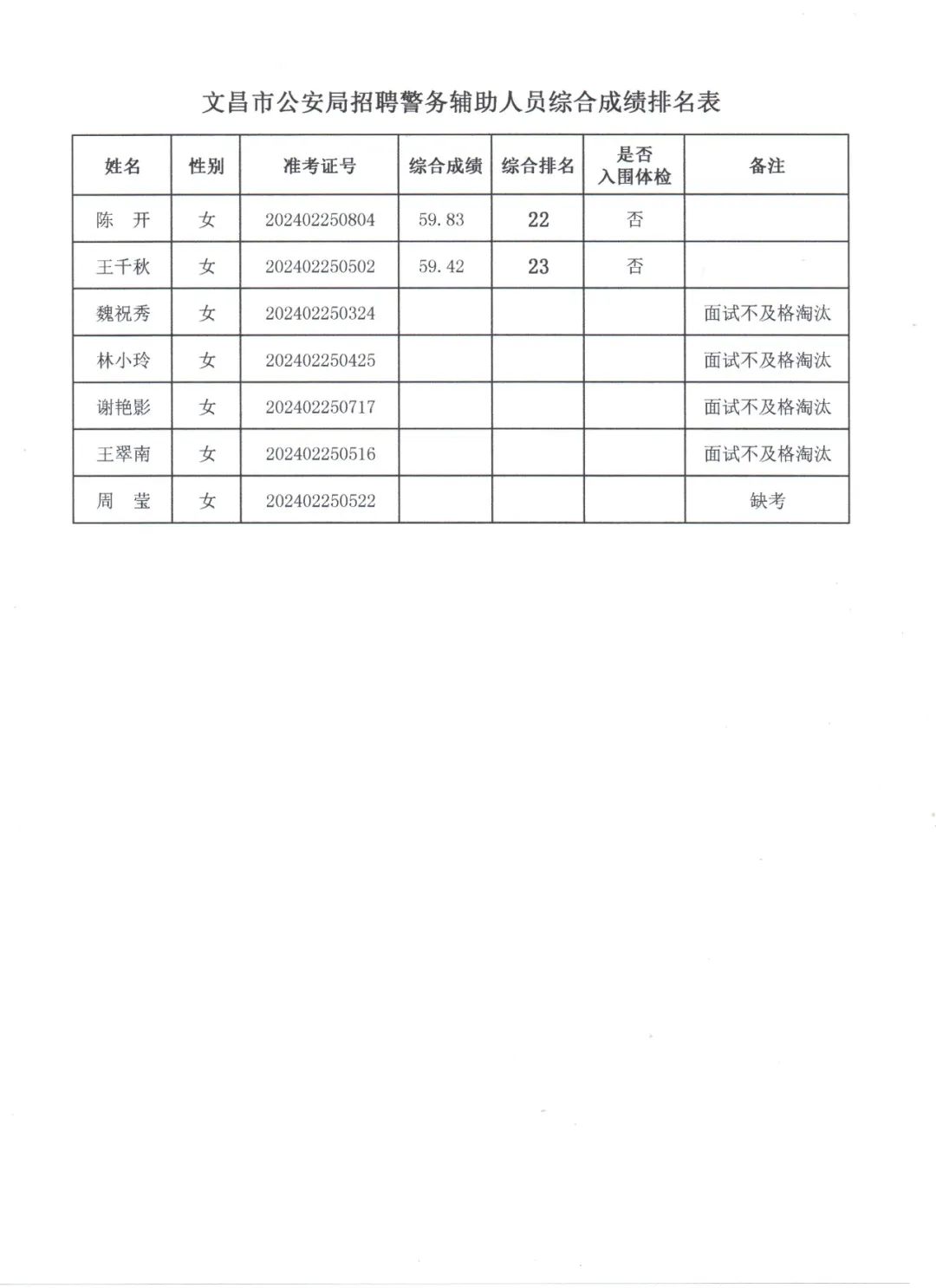 根据《文昌市公安局公开招聘警务辅助人员公告》要求,经笔试、体能测试和面试,现将文昌市公安局公开招聘警务辅助人员的考试综合成绩以及入围体检的考生名单予以公布,并将下步体检工作安排公告如下: