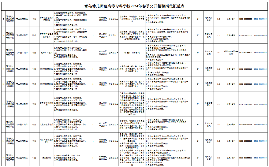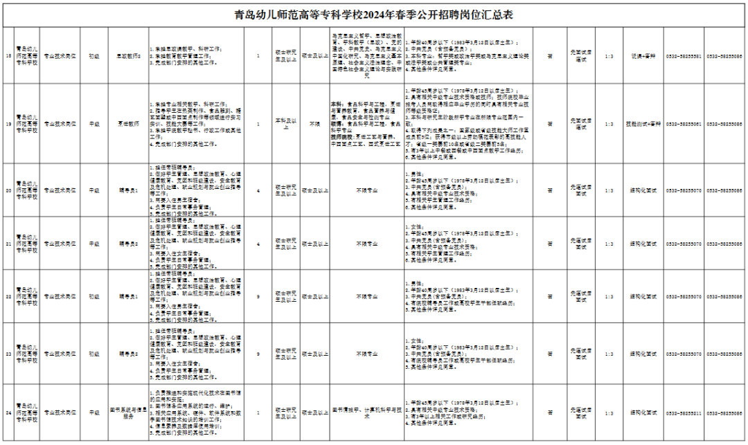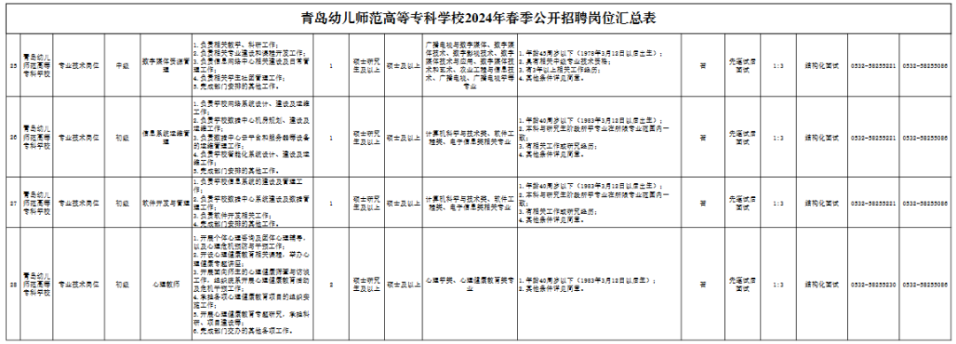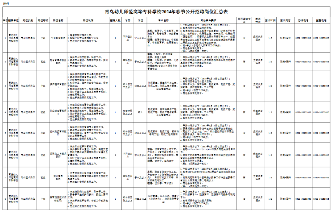 青岛幼儿师范高等专科学校2024年春季公开招聘简章一、单位简介 青岛幼儿师范高等专科学校为全日制公办普通高等专科学校,2020年3月经山东省人民政府批准设立,2020年5月教育部备案。学校位于中国—上海合作组织地方经贸合作示范区(胶州经济技术开发区)核心区,占地面积503.8亩,地处胶州湾北侧,北邻胶东机场,南接胶州湾跨海大桥,地理位置优越,交通便利。学校配备与专业设置相适应的教学、实习、实训场所及教学仪器、图书资料,建设自然科学实验室、艺术实训室、艺术演播中心、专业实训室等共计396间。 学校2020年首次招生5个教育类专业,2021年新增7个招生专业,2022年新增特殊教育专业,2023年新增12个专业,2024年新增1个学院3个专业,届时学校招生专业共涵盖8个专业大类,28个招生专业。目前,学生总数5020人,在编教职工250人。 二、招聘岗位、人数 根据《事业单位人事管理条例》(国务院令第652号)、《事业单位公开招聘人员暂行规定》(人事部令第6号)等文件要求以及省、市有关规定,结合工作需要,青岛幼儿师范高等专科学校拟面向社会公开招聘63人。具体岗位及条件详见《青岛幼儿师范高等专科学校2024年春季公开招聘工作人员岗位汇总表》(以下简称《岗位汇总表》)。 三、招聘条件 面向社会公开招聘人员,应符合以下条件: (一)具有中华人民共和国国籍; (二)政治立场坚定,拥护中国共产党领导和社会主义制度; (三)遵守宪法和法律; (四)具有良好的道德品行和适应岗位的身体条件、心理素质; (五)符合招聘岗位的学历、学位、专业、方向等要求;招聘岗位的学历、学位、专业、方向等条件有对应关系。 1.《岗位汇总表》“专业名称”栏中所列专业,如无特殊说明均指具体专业(二级学科),不含同名一级学科下的其他专业。 2.“专业名称”栏中所列专业要求门类、一级学科(类)的,相应门类、一级学科(类)下所有专业毕业生均可应聘。应聘人员所学专业与招聘岗位要求专业符合教育部新旧专业对照关系的,该专业毕业生也可应聘。 3.招聘专业的认定一般以应聘人员所获毕业证书上注明的专业为准,其中,辅修专业证书与学历证书配合使用,可依据辅修专业证书上注明的专业应聘。国(境)外高校毕业生获得教育部授权教育部留学服务中心出具的学历学位认证后,可应聘同等学历层次普通高校毕业生的岗位。其所学专业是否符合招聘专业要求,由学校认定。 高级技工学校、技师学院全日制毕业生,毕业时取得高级工、预备技师职业资格的,可分别按照全日制高职(大专)、本科毕业生应聘符合条件的岗位。招聘岗位要求的学历(毕业)证书、获奖证书、职业资格证书等须在2024年3月12日之前取得。 4.时限要求:应届高校毕业生的学历证书、学位证书等相关证书及材料一般应在2024年7月31日及以前取得,应聘人员的其他相关证书及材料一般应在2024年3月12日及以前取得。 (六)在职人员(含已签订就业协议人员,下同)应聘的,须征得所在单位(就业协议单位,下同)同意; 在职人员是指与企业建立劳动关系、被国家机关录用、被事业单位聘用的人员。签订就业协议人员是指与单位签订初步就业协议的人员。 (七)年龄根据不同招聘岗位和专业分别设定(详见附件1); (八)定向委培毕业生报考,须征得定向单位同意; (九)具备招聘岗位所需的其他条件; (十)法律、法规规定的其他条件。 具有以下情形者,不得应聘: (一)现役军人、在读的全日制普通高校非应届毕业生,不得应聘。在读全日制普通高校非应届毕业生不能用已取得的学历学位作为条件应聘; (二)因犯罪受过刑事处罚的人员、被开除党籍的人员、被开除公职的人员,以及法律法规规定不得聘用的其他情形人员不得应聘; (三)应聘人员不得报考有《事业单位人事管理回避规定》(人社部规〔2019〕1号)中应回避情形的岗位。 四、招聘方式及程序 报名采取网上报名、网上初审、网上缴费方式进行。 网上报名时间:2024年3月12日9:00-3月15日12:00 网上审核时间:2024年3月12日14:00-3月15日16:00 网上缴费时间:2024年3月12日14:00-3月16日12:00 (一)发布招聘信息 通过青岛幼儿师范高等专科学校网站和官方微信公众号面向社会发布招聘信息。 (二)报名 报名采取网上报名方式。应聘人员通过青岛幼儿师范高等专科学校网站(http://www.qdpecedu.cn/)“春季招聘报名入口”进行网上报名、查询、缴费、打印准考证,每人限报一个岗位;应聘者提供的相关材料信息如有不实,一经发现取消资格。初审通过,报名信息不能更改。2024年3月15日16:00后初审未通过的,不能改报其他岗位,不能再修改、补充报名信息。 应聘者须上传的材料如下: 1.有效居民身份证正、反面扫描件; 2.符合岗位学历、学位、专业要求的学历证书、学位证书(原件扫描件)。应聘岗位为二级学科具体专业的,毕业证书或相关材料上注明的专业为一级学科(类)的,还需同时提交所学具体专业(二级学科)的证明(附件2)和课程成绩单扫描件。应届毕业生应聘的,可提供就业推荐表、学校相关部门出具的学历(专业)学位证明或教育部学籍在线验证报告之一(原件扫描件)。海外留学人员须有经教育部留学服务中心出具的《国外学历学位认证书》(原件扫描件); 3.报名系统下载《应聘事业单位工作人员诚信承诺书》(以下简称《诚信承诺书》),粘贴本人照片并签名摁手印后扫描件; 4.在职人员(含已