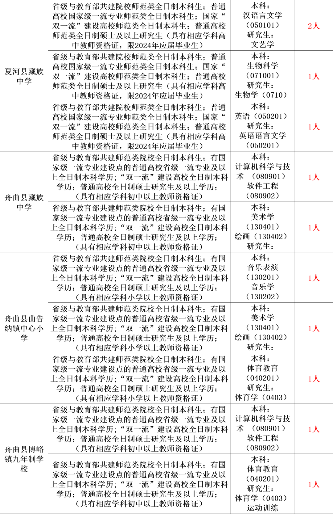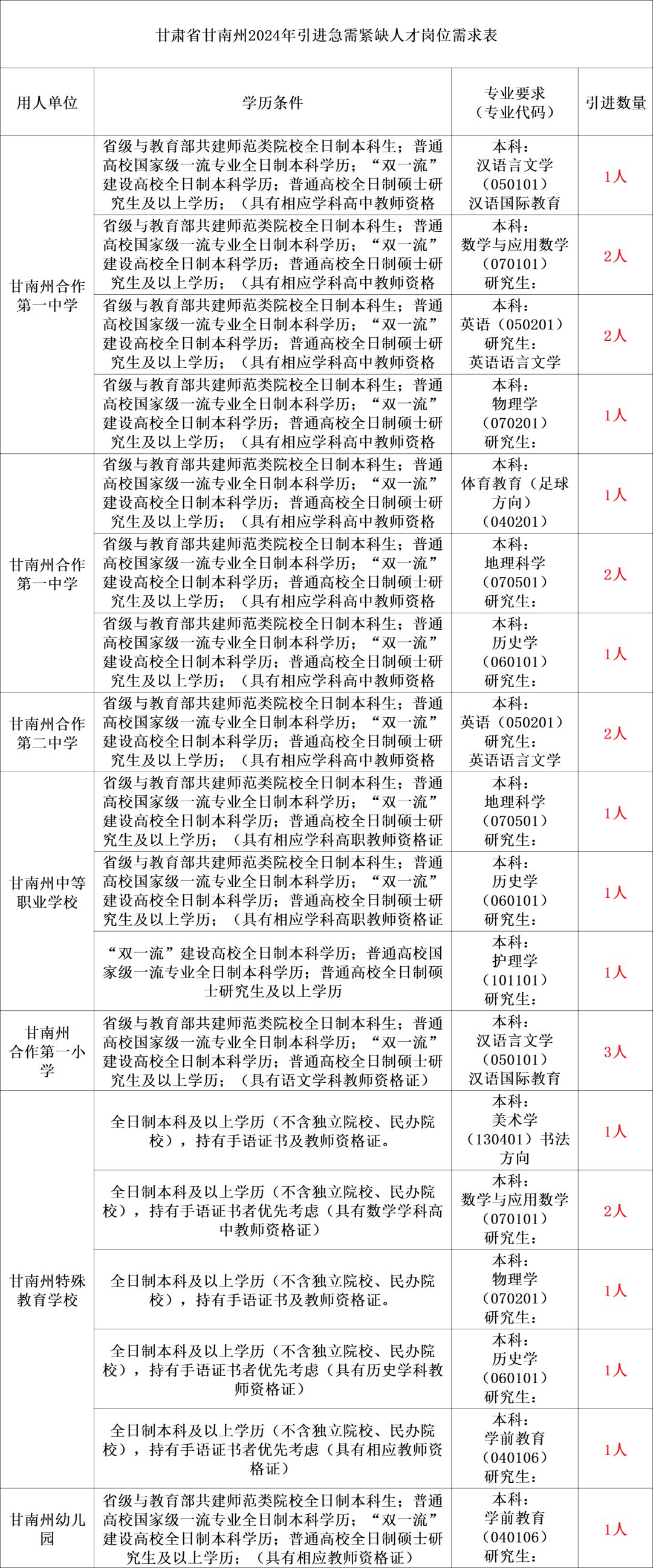 本次全州事业单位引进急需紧缺人才73名点击获取职位表,其中州直部门(单位)引进25名、县市引进48名,引进人数、具体需求专业及岗位条件详见《甘肃省甘南州2024年引进急需紧缺人才岗位需求表》(附件1)。
