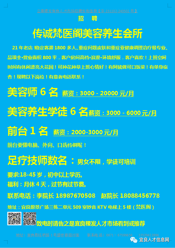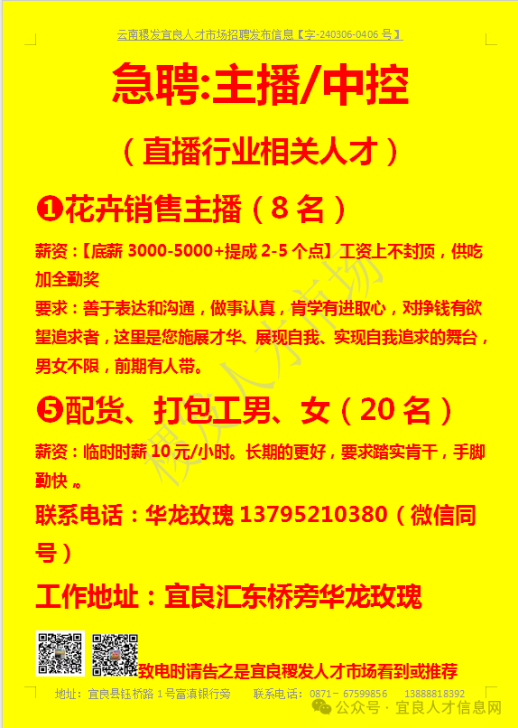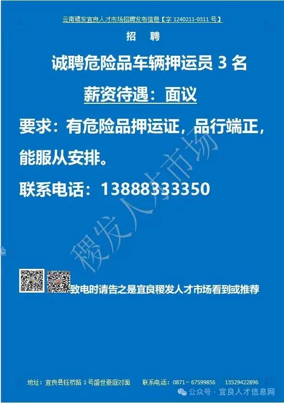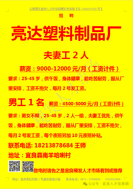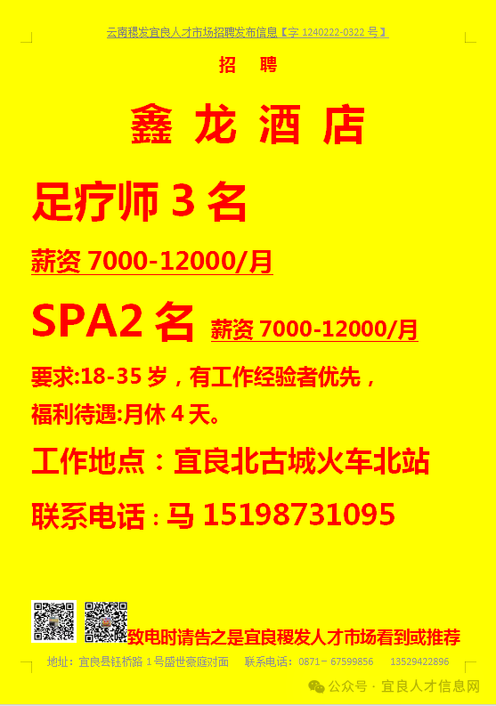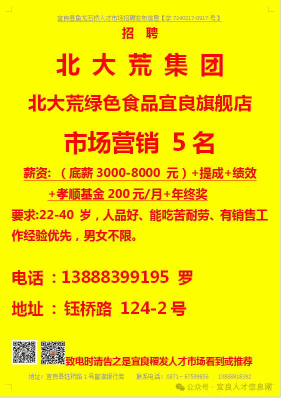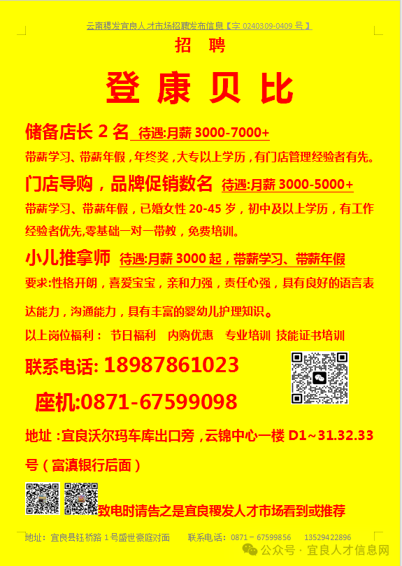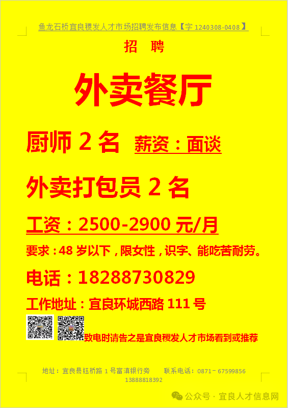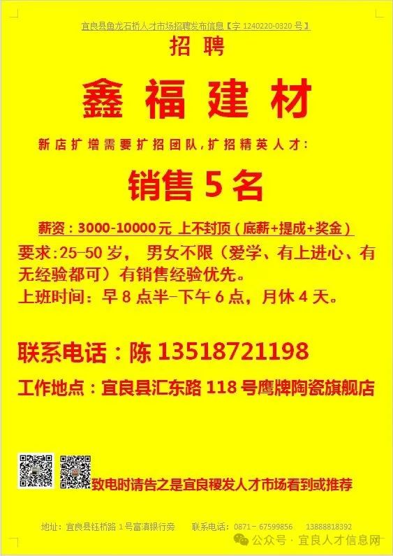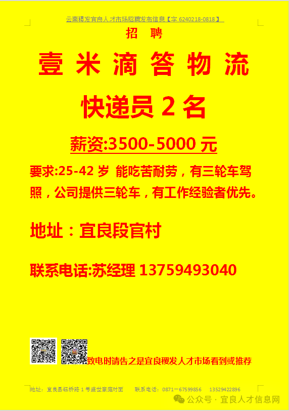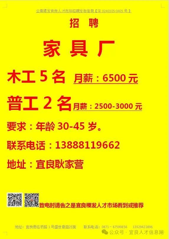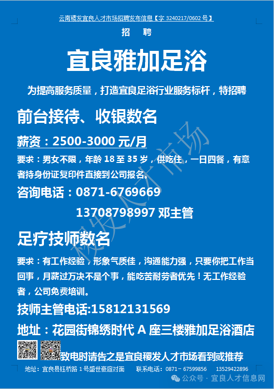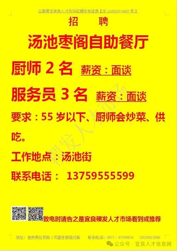 信息发布咨询地址:宜良稷发人才市场一楼大厅