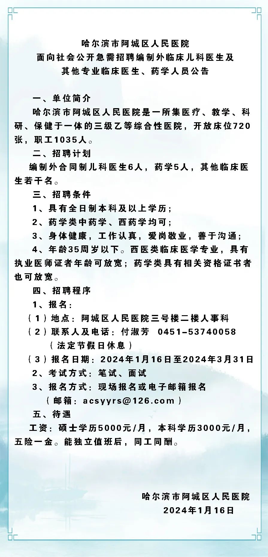 温馨提示:黑龙江省哈尔滨市阿城区人民医院,2024年招聘儿科医师、临床医师、药师等人才,报名截止至2024年3月31日。欢迎人才加入我院!