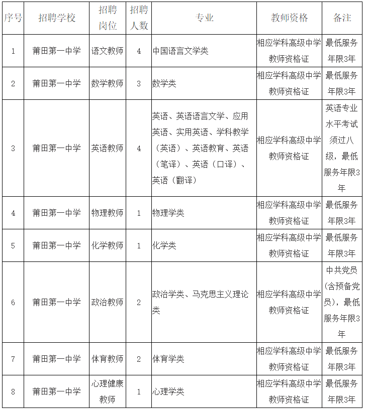 在莆田市人社局(http://rsj.putian.gov.cn)、莆田市教育局(http://jyj.putian.gov.cn)、莆田第一中学(http://www.fjptyz.com)等有关网站上发布招聘方案等信息。