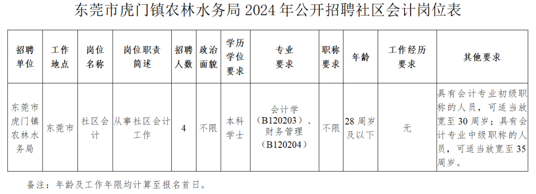 因工作需要,东莞市虎门镇农林水务局拟面向社会招聘社区会计4名。现就有关事项公告如下: