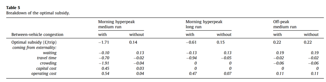 表5显示,中期时针对早高峰时段的最优补贴为负值,通过细分项发现,需求方的外部不经济(尤其是拥挤成本)是导致出现补贴为负的主要原因。对比非早高峰时段的结果,说明拥挤是导致这一差别的主要原因。同时,文章尝试放宽最高车次频率限制并计算了新的最优补贴,结果显示为正,进一步验证了拥挤带来的严重负外部性。