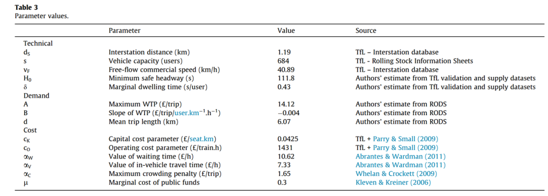 文章选用线性模型,使用的参数分为三类:技术、需求与成本。技术参数部分,最小安全车距和边际停留时间是通过实际供应量与观测需求量的回归来估算的。需求参数部分,假定广义需求价格弹性为0.75,将观测到的需求水平与广义价格相交估算出线性需求函数。成本参数部分,资本成本和运营成本参数利用伦敦交通局的财务报告进行估算,其他参数设置参考了既有文献,具体数据来源如表3所示。