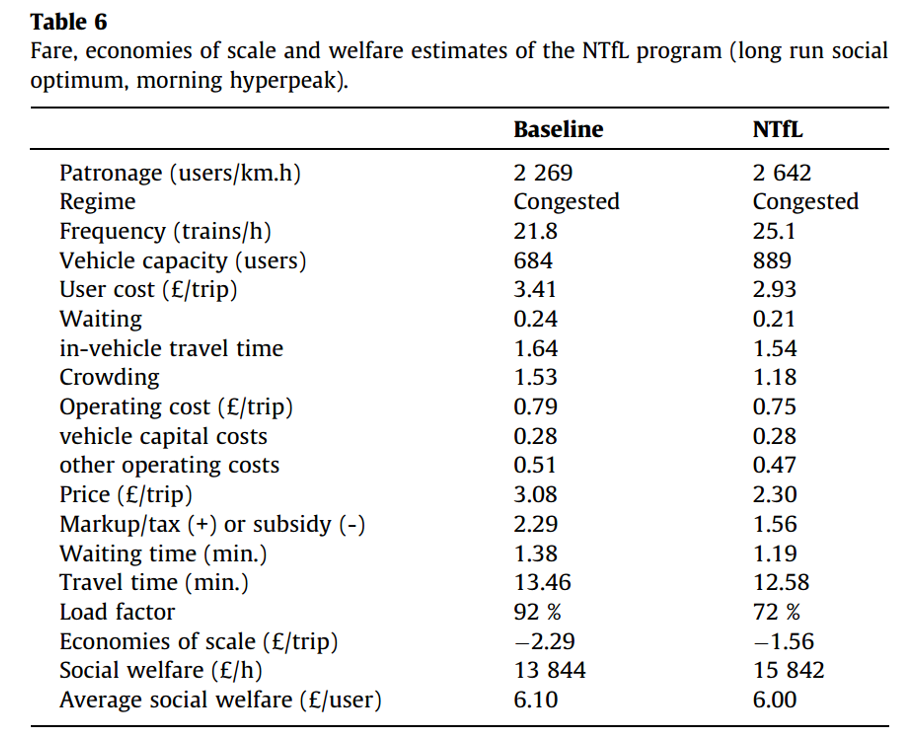 通过模拟发现,在基准方案中,需求增加将导致服务质量大幅度下降,车次频率降低,负载率提升,边际用户对其他用户造成的外部成本更大,因此规模不经济更严重。“伦敦新地铁”方案的实施将显著提高车次频率和舒适度,负载率下降。尽管由于需求量的提升无法解决拥挤问题,但通过提高运营效率可以缓解规模不经济现状(-32%),并提升社会整体福利收益(+15%)。