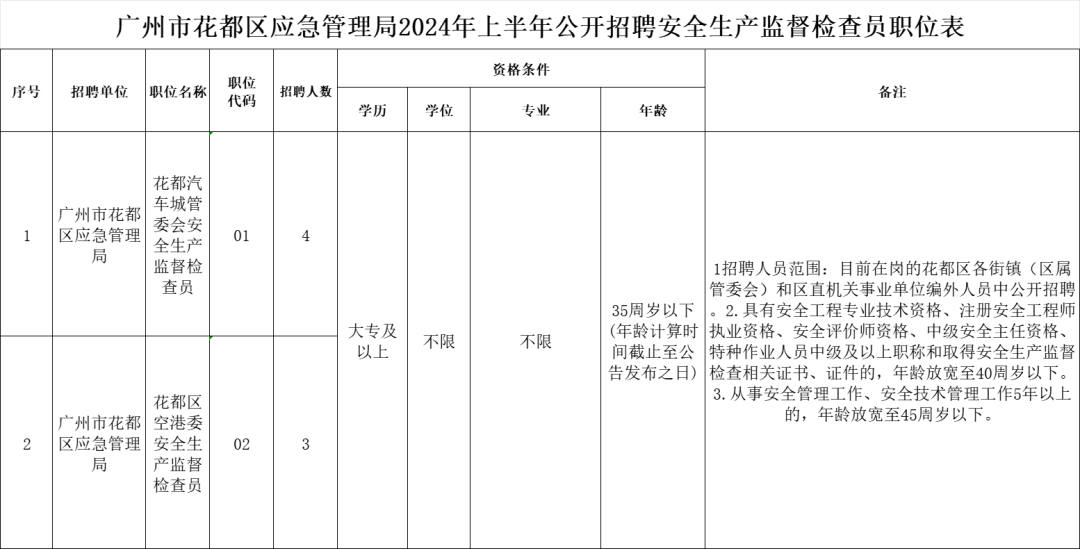 (一)基本条件 1.思想政治素质好,拥护党的路线、方针、政策,具有坚定正确的政治方向和全心全意为人民服务的宗旨意识。 2.事业心责任感强,热爱安全生产管理工作,具有吃苦耐劳、无私奉献精神。 3.遵纪守法,服从安排,具有较强的组织纪律观念。 4.应具有国家承认的大专及以上学历。 5.有一定的文字书写、语言表达、组织协调能力和计算机应用操作能力。 6.年龄35周岁以下(具有安全工程专业技术资格、注册安全工程师执业资格、安全评价师资格、中级安全主任资格、特种作业人员中级及以上职称和取得安全生产监督检查相关证件的,年龄可放宽至40周岁以下;从事安全管理工作、安全技术管理工作5年以上的,年龄可放宽至45周岁以下)。 7.身体健康,能适应在艰苦条件下工作。 8.法律、法规规定的其他条件。 (二)政策性加分条件(加分指引详见附件4) (三)不得报考情形 有下列情形之一的,不得报名: 1.因受纪律处分正在处分期内的、正在接受司法机关立案侦查或纪检监察机关立案审查的人员。 2.近2年内,在全国机关、事业单位招聘考试、体检、考察环节中存在违纪行为的人员。 3.聘用后即构成回避关系的。 4.被依法依规列为失信联合惩戒对象的人员。 5.法律、法规和规章规定不宜聘用为安全生产监督检查员的其他情形。 招聘条件中所涉及的年龄、工作经历年限、处分期限等时间点的计算截至公告发布之日。 本次招聘实行竞争性选拔考试。按照报名(须有现工作单位推荐信)、资格审查、考试(面试)、考察、公示和聘用等程序进行。 (一)报名 1.报名时间:2024年3月6日至3月12日。 2.报名方式:采取发送电子邮件的网上报名方式。考生按要求提供《广州市花都区应急管理局公开招聘安全生产监督检查员报名表》(附件2,须填写完善后打印并签名)、身份证(正反面)、学历学位证书、各类资格证书、现工作单位推荐信等相关材料扫描件,同时,提供《广州市花都区应急管理局公开招聘安全生产监督检查员报名信息表》(附件3)电子版。以上材料发送到电子箱:yaoyh@huadu.gov.cn,邮件标题注明“安全生产监督检查员-姓名-手机号码”。报考人员在报名时须如实填报相关信息,确保邮件材料真实、清晰、完整、齐全,因不实填报、信息不全等影响报名的,责任自负。 报名咨询电话:020-36902688-2093,咨询时间:法定工作日周一至周五(上午9:00-12:00,下午14:00-18:00)。 (二)资格审查 报名工作结束后3个工作日内,招聘工作领导小组办公室对报名人员进行资格审查。资格审查通过的人员名单,在广州市花都区人民政府门户网站(https://www.huadu.gov.cn/gzhdyj/gkmlpt/index)发布。 资格审核贯穿公开招聘全过程,报考人员须对报名材料的真实性和完整性负责。凡提供虚假材料的,一经查实,取消报考资格或聘用资格,并记录在案。 (三)考试(面试) 面试时间和地点:以公告为准。 面试内容:采用结构化面试,主要考察报考人员的综合分析能力、组织协调能力、语言表达能力、举止仪表等。 成绩的计算方法:面试满分为100分,在面试成绩基础上进行政策性加分,构成综合总成绩。 面试结束一周内,考试综合总成绩及体检名单在广州市花都区人民政府门户网站(https://www.huadu.gov.cn/gzhdyj/gkmlpt/index)公布。 (四)考察与公示 在考试综合总成绩合格的基础上,根据考试综合总成绩从高分到低分的顺序按拟招聘职位人数1:1的比例确定考察对象,如果同一职位的考生综合总成绩相同,则确定为考核人选顺序依次为具有两项政策性加分、一项政策性加分、无政策性加分;若出现均无政策性加分的情况,则按照本公告政策性加分条件的专业、从事相关工作经历的顺序由上而下确定为考核人选,并根据考察结果择优录取。 考察内容主要包括思想政治表现、道德品质、业务能力、学历情况、工作实绩等,并提供以下材料原件及复印件核实其是否具备报考资格:《报名表》、毕业证书、学历鉴定、身份证、户口本、报考职位要求提交的所有证件与证明,资料均以原件为准,仅提供复印件或其他证明材料等一律无效,原件审查后退还。 考察结果在广州市花都区人民政府门户网站(https://www.huadu.gov.cn/gzhdyj/gkmlpt/index)公示5个工作日,公示期满没有异议的,按有关规定办理分配、聘用手续。如考核不合格或考生自动放弃,可在综合总成绩合格的考生中按成绩高低顺序依次递补人选。 (五)聘用 用人单位与拟聘用人员签订劳动合同,办理聘用手续,按照《劳动合同法》等法规实行合同制管理,不占用机关事业编制。合同期满可根据工作需要和本人意愿续签劳动合同。合同期未满违约的,按劳动合同相关条款处理。 安全生产监督检查员工资经费列入市、区、街镇(委员会)年度财政预算予以保障,包干经费7万元每人每年。 (一)报考人员参加面试时,必须按要求携带身份证件准时参加。 (二)拟聘人员应在规定时间内报到,未在规定时间内报到的视为自动放弃聘用资格。 (三)本次招聘不收取任何报考费用,不举办、不委托任何机构举办考试辅导培训班,也不指定任何参考用书和资料。社会上任何以事业单位考试命题组、专门培训机构等名义举办的辅导班、辅导网站或发行的出版物、参考资料、上网卡等,均与本次招聘无关。 本公告未尽事宜,按相关政策处理。本公告由广州市花都区应急管理局负责解释。 附件1广州市花都区应急管理局2024