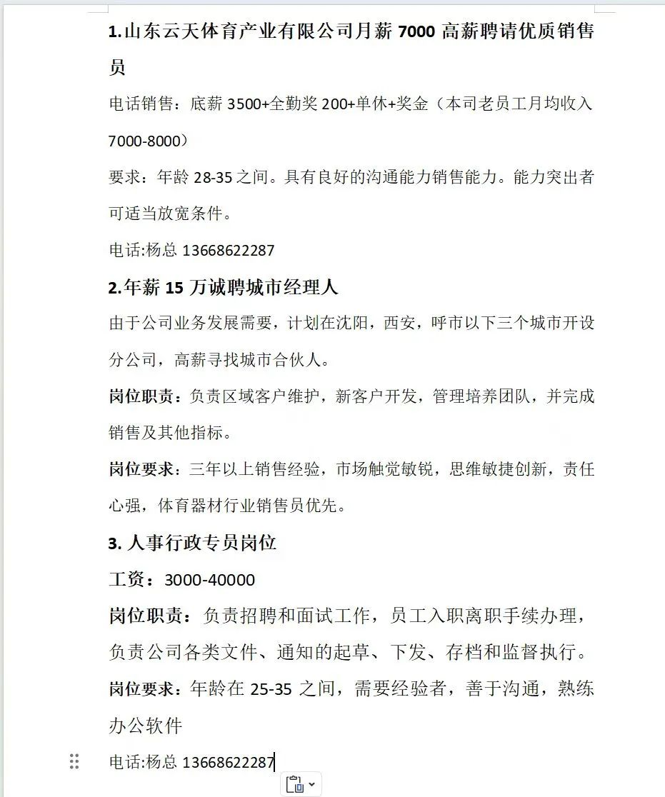 3.业务员多名,男女不限,年龄40岁以下,三个月试用期后缴纳社保,工资2600元/月+提成。