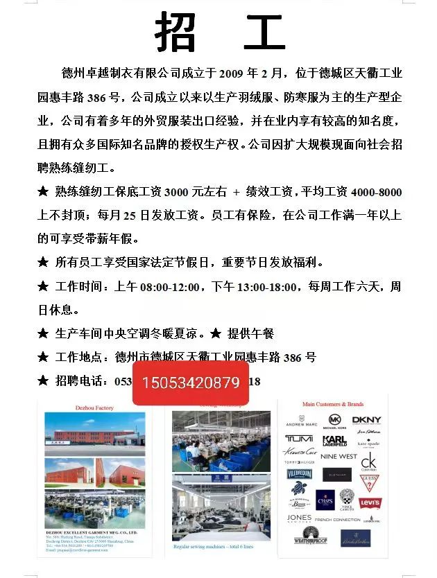 2.车间操作工15人,女,心灵手巧者优先入用,计件工资,待遇优厚!
