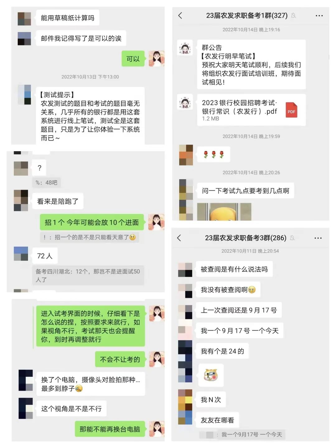 25年毕业的你对于备考是否存在很多疑惑? 第一步:关注农发求职备考公众号 查看学长学姐备考经验贴 各省考情分析+面试真题推文 第二步:添加樱桃老师或小玉老师微信 加入2025年备考群 上岸学长学姐群内答疑+直播分享会 (图片展示历年备考群交流情况)