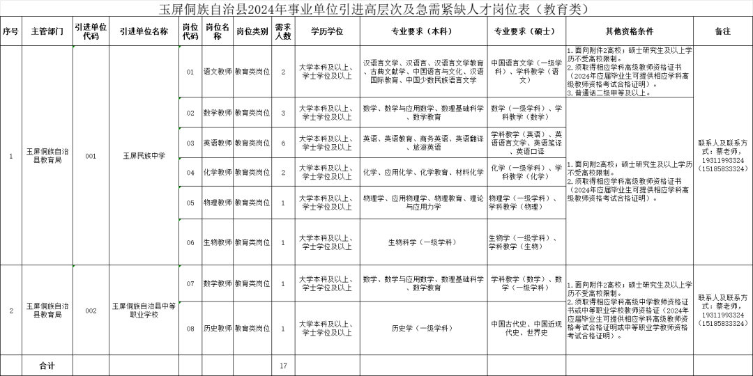 为加强我县事业单位人员队伍建设,配强高层次及急需紧缺人才,促进全县经济高质量发展。根据《事业单位人事管理条例》等相关规定,经县委人才工作领导小组研究,决定玉屏侗族自治县2024年相关事业单位教育类岗位面向社会公开引进高层次及急需紧缺人才17名,为确保人才引进工作的顺利完成,特制定本简章(以下简称“简章”)。 一、组织领导机构 为切实加强对本次人才引进工作的组织领导,确保工作有序开展,我县成立了2024年事业单位人才引进工作领导小组。领导小组下设教育类岗位人才引进工作专班,该专班具体由县教育局牵头,负责教育类岗位人才引进工作。 二、引进人才的原则、范围及计划 (一)引进原则。坚持按需引进、以用为本、简化程序和公开、公平、公正、择优的原则。 (二)引进计划。计划引进高层次及急需紧缺人才(教育类岗位)17名,其中:玉屏侗族自治县中等职业学校2名、玉屏民族中学15名。详情见《玉屏侗族自治县2024年事业单位引进高层次及急需紧缺人才岗位表(教育类岗位)》(附件1)(以下简称“岗位表”)。 (三)引进范围。面向国内外高校毕业生公开引进(含2024年应届毕业生),教育类岗位面向附件2高校引进。硕士研究生及以上学历不受以上高校限制。 委托培养、在职培养和定向培养的应届毕业生,独立学院毕业生,各类成人教育、远程教育毕业生不列入事业单位引进对象范围。 三、相关信息发布 本次人才引进的相关信息均在“玉屏侗族自治县人民政府网”(http://www.yuping.gov.cn/)发布。 四、人才引进对象及条件 (一)对象及条件要求 1.具有中华人民共和国国籍,遵守宪法和法律,具有良好的品行;拥护中国共产党的领导,热爱祖国,有良好的职业道德; 2.具有国家承认的学历,并具备拟报考职位要求的资格条件; 3.年龄在18周岁以上(2006年3月6日及以前出生),35周岁及以下(1989年3月6日及以后出生);具有硕士研究生及以上学历学位或者副高级专业技术职务资格的年龄放宽到40周岁(1984年3月6日及以后出生);具有博士研究生及以上学历学位或者正高级专业技术职务资格的年龄放宽到45周岁(1979年3月6日及以后出生); 4.具有正常履行岗位职责的身体条件; 5.取得相应学科高级中学或中等职业教师资格证书(2024届应届毕业生可持教师资格考试成绩合格证明,且须在2024年7月31日前取得相应学科高级中学或中等职业教师资格证书); 6.报考人员系2024年应届毕业生的,须在2024年12月31日获得相应的学历学位证书; 7.具有报考职位所需的其他资格条件。 (二)凡有下列情形之一者,不得报名: 1.不能坚持党的基本路线,在重大政治问题上不能与党中央保持一致的; 2.受过党纪、政纪处分的; 3.曾被开除公职的,或曾在机关(含参照公务员法管理单位)、事业单位工作被辞退的; 4.曾因犯罪受过刑事处罚的,有违法违纪嫌疑正在接受审查的; 5.2024年应届毕业生定向到具体单位的定向生和委培生;截止报名时仍在岗的“农村义务教育阶段学校教师特设岗位计划”人员(含参加2024年度计划已签约的); 6.截止2024年3月6日,铜仁市内机关(含参照公务员法管理事业单位)、事业单位在职在编人员(含试用期人员)及辞职(解聘)未满一年的; 7.经人民法院决定纳入的失信被执行人; 8.应聘人员在以往考试过程中,有违纪违规行为,被记入诚信档案库,未过记录期限的; 9.在读的在校生或现役军人; 10.不符合引进职位所需学历学位及其他资格条件的; 11.其他按法律、法规规定不得聘用为事业单位工作人员的。 五、人才引进程序 本次人才引进工作实行公开条件、公开岗位、公开报名、公开考试、公开聘用、公开监督,并严格按照信息发布、报名及资格审查、考试、体检、考察、公示、聘用备案等程序进行。 六、报名及资格审查 (一)报名方式、时间及地点 1.本次引进高层次及急需紧缺人才报名工作采取现场审核及现场报名的方式进行。 2.报名时间及地点 (1)第一场次报名 报名时间:2024年3月13日 9:00—17:00 地点:重庆市北碚区西南大学招生与就业指导处。 (2)第二场次报名 报名时间:2024年3月19日 9:00—17:00 地点:贵州省贵阳市花溪区贵州师范大学招生与就业指导处 在报名工作中,第二场次引进在第一场次招聘工作完成后,根据第一场次引进报名及考试情况公告剩余岗位进行第二场次报名,如在第一场次部分岗位已招满的,该岗位不再到第二场次进行报名,若所有岗位在第一场次报名引进后没有空缺岗位时,第二场次报名将取消。 (二)报名要求 1.报考人员须在规定的时间内报名,每名报考人员限报一个职位。报考两个及以上职位的考生,视为报名失败。 2.报考人员须认真阅读本简章,按照本简章和岗位表公布的条件和要求报名,并提供与之相符且真实有效的报名材料。如有隐瞒真实信息、弄虚作假,持伪造证件、证明及其他材料获得考试资格的,一经查实,即取消应聘资格。 3.报名所需资料:报考人员需填写《玉屏侗族自治县2024年事业单位引进高层次及急需紧缺人才报名信息表(教育类岗位)》(附件3)(以下简称“报名表”)1份,提供毕业证(2024年应届毕业生提供就业推荐表)、学位证、有效居民身份证(含有效临时居民身份证)、相应学科高级中学或中等职业教师资格证(2024届应届毕业生可持教师资格考试成绩合格证明,且须在2024年7月31日前取得相应学科高级中学或中等职业教师资格证书)。与职