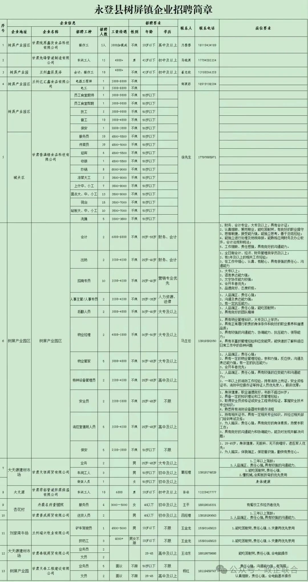 >【精选岗位】永登县树屏镇企业招聘岗位汇总表