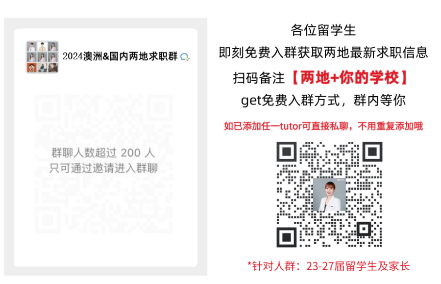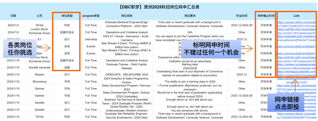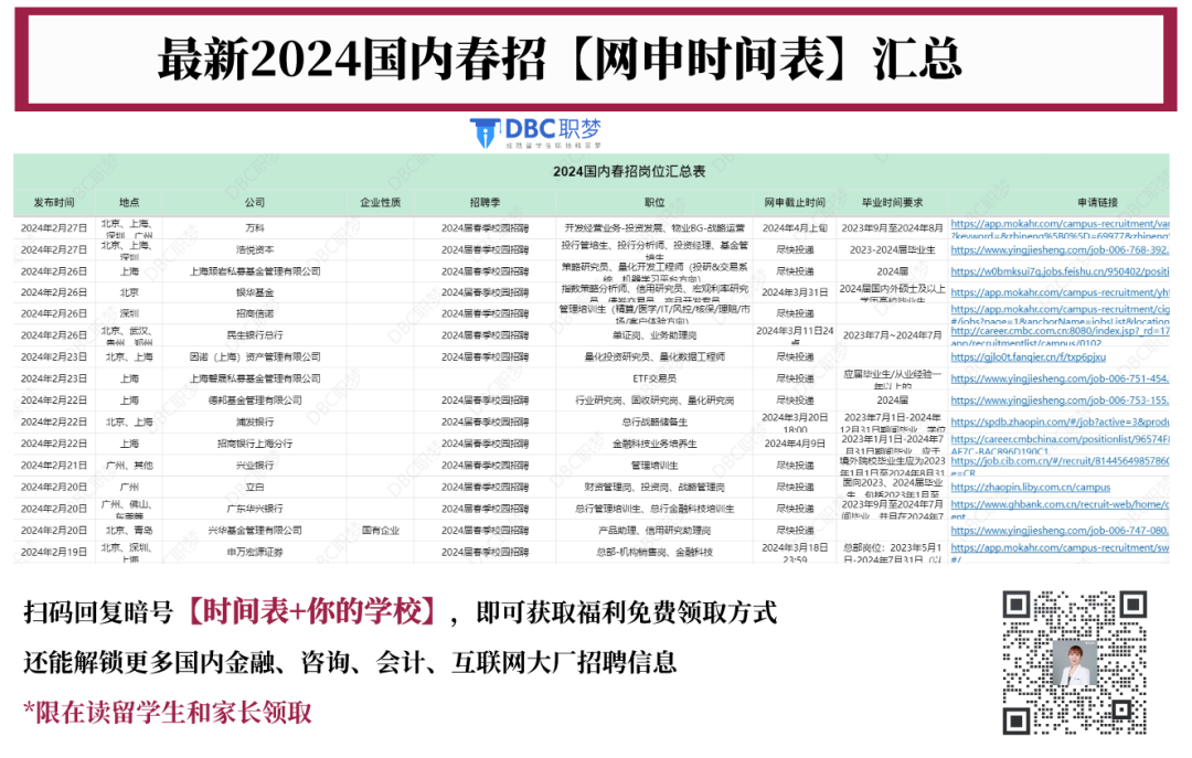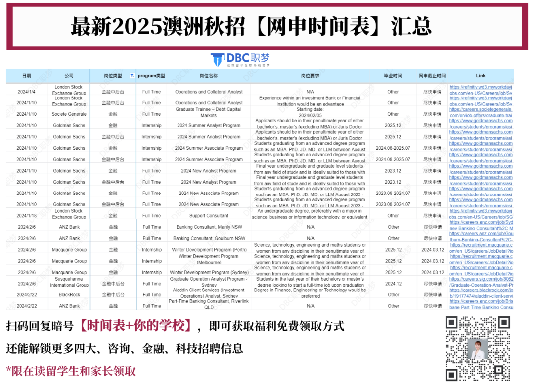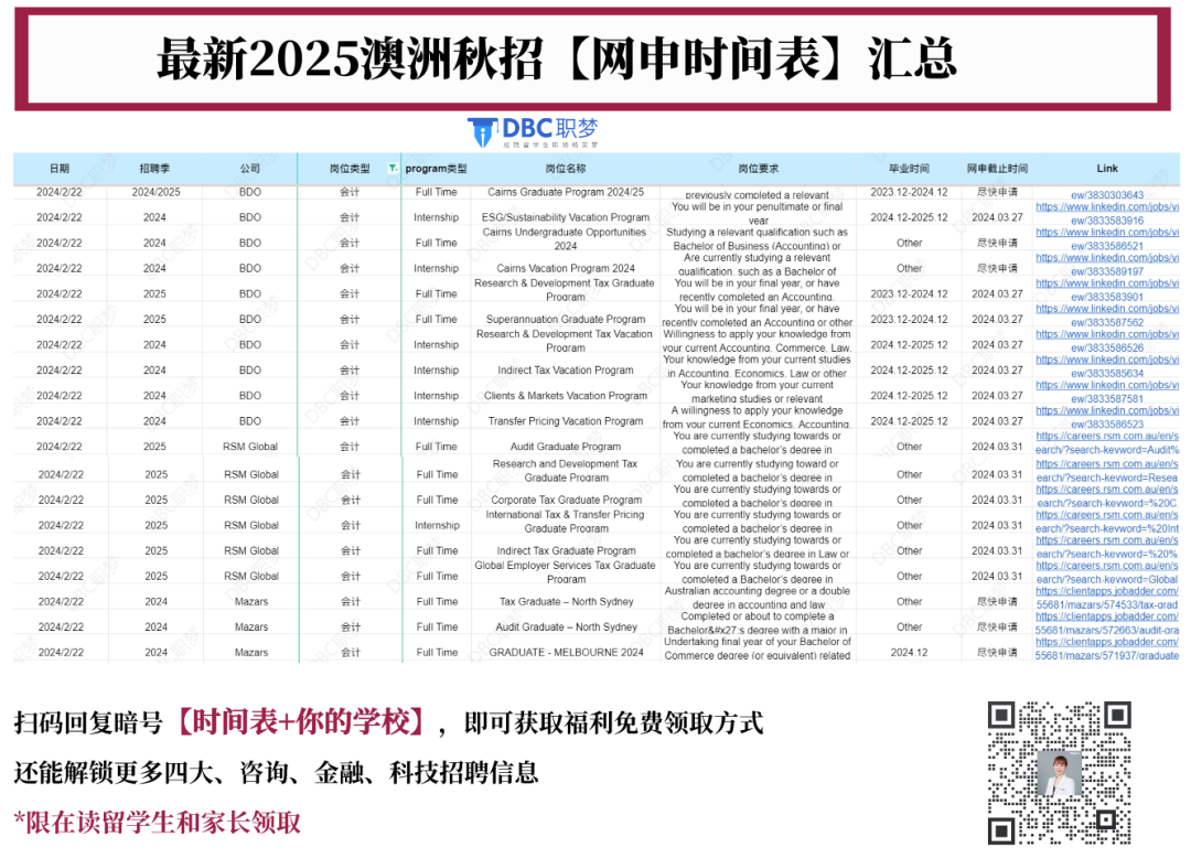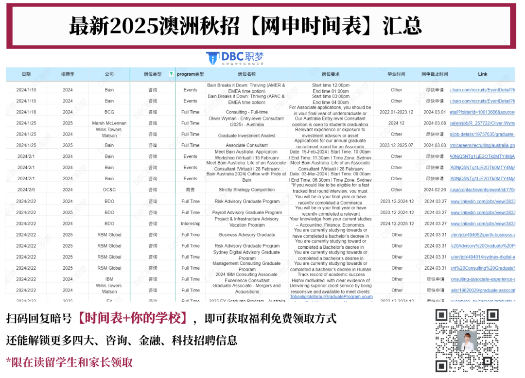 扫码添加 DBC职梦澳洲Tutor,回复暗号【时间表+你的学校】,即刻获取国内春招网申表免费领取方式。  考虑到大家信息收集渠道有限,除了网申汇总表之外,澳骄妹还建议你加入2024年 · 澳洲&国内两地求职群就能一次性领取以下全部福利哦 💡求职信息播报:澳洲、国内2024-25招聘季校招岗位汇总(更新至2.29)💡中澳Big Name网测OT真题题库:真题资料,配套视频 💡中澳各大公司真实面经:行为面、群面、技术面,一套全搞定校招岗位转瞬即逝,谁的消息最灵通,谁就拥有抢跑投递的资格 澳骄妹今天,就是来一步一步解决大家可能出现的各种信息差!四大|金融|咨询|科技…你感兴趣的行业,都能立马找到对应春招岗位 具体岗位、申请截止日期、投递要求、以及投递链接都已清楚标明,领表即可实现傻瓜式投递👇🏻