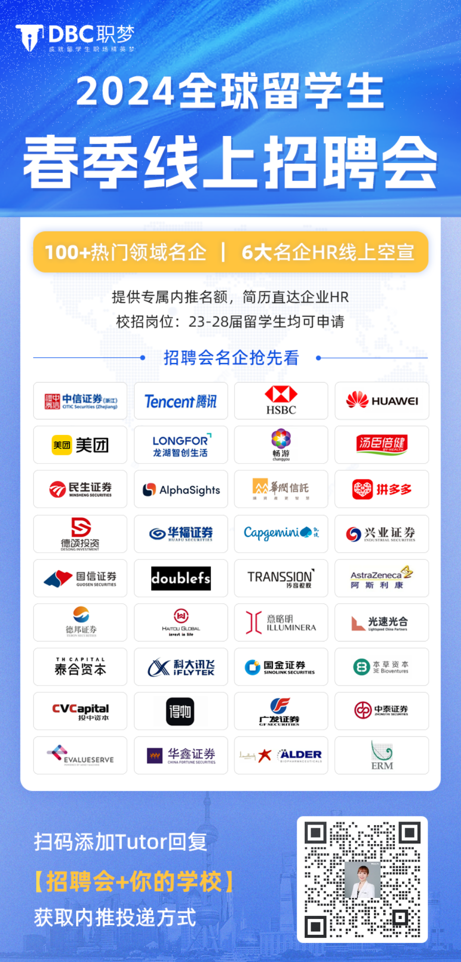 如果你已经添加过其他的Tutor 回复暗号即可领取福利,无需重复添加 为帮助广大留学生快人一步拿到Offer 2024 | 全球名企春季线上空宣会 覆盖金融、咨询、科技、快消等热门行业 开放300+留学生专属免费内推名额! 让你的简历跳过海投,一键直达HR *该名额仅提供给本公众号的用户,为独家福利 DBC职梦学员斩获Offer数量突破11165 张!DBC职梦将继续秉承“成就留学生职场精英梦”的初衷「求真务实」是我们整个企业一直践行的价值观,我们坚持1张1张的积累,杜绝任何环节的虚假增长。 |