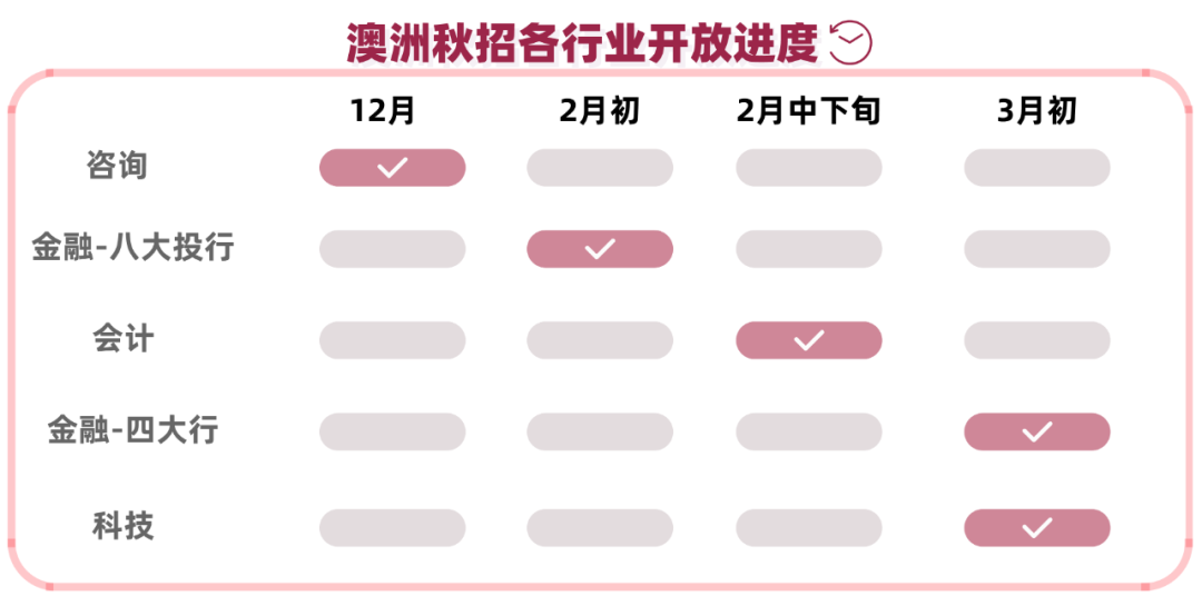 随着PwC,Deloitte分别在2月26日、28日开启秋招,澳洲四大已全部开岗。除了四大之外,还有BDO,RSM Global等会计公司开放了秋招岗位。 目前最早开放网申的EY已经进入到了网测阶段。 与咨询、金融公司相比,会计公司招聘的岗位更全。Audit、Tax、Consulting等岗位一应俱全,Graduate Program和Vacation Program也一个不少! 而澳洲会计公司向来是澳洲留学生的求职大热门,所以同学们领取了网申表之后,要抓紧时间投递简历!  作为最早开放秋招网申的行业,澳洲各大咨询公司的秋招进度是最快的,而这也意味着澳洲咨询公司的网申通道关闭也相对较早。例如Marsh McLennan,在2月12日就关闭了网申通道,A.T. Kearney也在2月25日关闭了网申。  金融行业紧随咨询行业的步伐,大部分公司在2月初就开启了网申通道。 而澳洲留学生青睐有加的四大行网申开启时间稍晚,CommBank在2月19日开放了网申通道,目前已经进入了网测阶段。 要知道,你的对手可是数万应届生!必须第一时间掌握网申信息,才能留出更充足的时间做准备。但招聘信息冗杂,靠自己搜集难度太大,而在这里岗位名称、截止日期、岗位要求及申请链接应有尽有,获取表格你就可以一键投递简历!最近澳骄妹也收到了不少小伙伴的留言,除了澳洲秋招岗位外,也在同步投递国内春招岗位,想知道目前国内春招岗位开放进度如何?2月底开始,国内春招岗位已经进入了爆发期,每天都以10+公司的开岗速度持续开放春招岗位。目前: