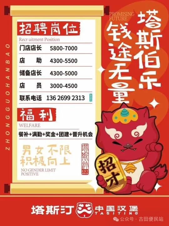 【工资】3000-4000元 【公司】塔斯汀汉堡店 【详情】汉堡店前台后厨 【电话】13626992313 【位置】宁德市古田县城西街道X916 【提醒】长按二维码识别查看职位描述