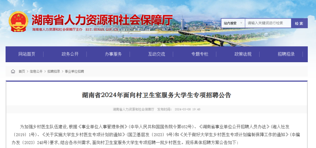 3月8日,湖南省人力资源和社会保障厅发布《湖南省2024年面向村卫生室服务大学生专项招聘公告》,面向村卫生室服务大学生专项招聘一批乡村医生。根据公告,此次招聘岗位109个,招聘计划109名,均为专业技术岗位。