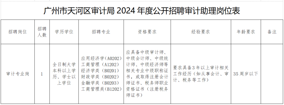 面向社会公开招聘,凡符合岗位招聘条件的人员,均可报考。报考人员须取得国家承认全日制本科及以上学历、学士及以上学位且同时具有与招聘岗位相匹配的专业及其他资格。 取得国(境)外学历、学位人员须在资格审查时出具教育部所属相关机构的学历、学位认证函及有关证明材料。 审计助理以劳动合同形式聘用,辅助开展审计专业岗位日常工作。招聘岗位详见《广州市天河区审计局2024年度公开招聘审计助理岗位表》(附件1)。