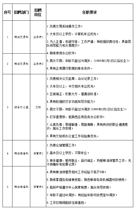 点击关注"阳泉市招聘"![]() 2024年山西省粮油交易中心公开招聘工作人员公告 根据用工单位需求,山西红杰人才集团有限公司受山西省粮油交易中心委托,面向社会公开招聘5名劳务派遣制工作人员。现将招聘内容公告如下: 一、招聘原则 本着公开公正、公平竞争、择优聘用、德才兼备的原则实施本次招聘工作。 二、招聘人数及具体