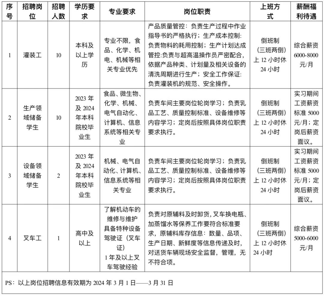 包头伊利乳业有限责任公司是伊利集团液态奶事业部下设的独立子公司,坐落在包头市稀土高新开发区黄河大街31号,成立于2001年10月20日,2003年2月正式投产,注册资金1.2亿元人民币,企业占地面积145亩。公司目前拥有14条进口生产线,日处理鲜奶能力达800吨。目前公司定位于液态奶高端品项的生产基地,主要生产的品项有:金典有机奶、金典纯牛奶、安慕希、QQ星儿童成长奶等系列产品。2021年顺利通过了制造业管理的诺贝尔奖-日本设备维护协会(JIPM)-A类审核、获得了包头市“市长质量奖”、通过“国家级绿色制造工厂”认证,高分通过国家一级安全标准化审核。现根据公司需求,特招聘以下岗位。