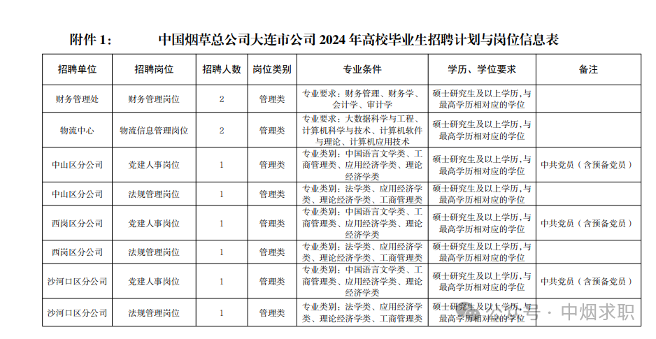 附件1:中国烟草总公司大连市公司2024年高校毕业生招聘计划与岗位信息表