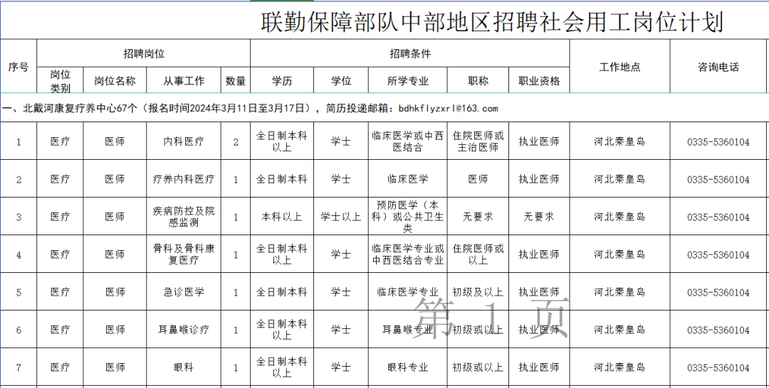 此次发布联勤保障部队中部地区社会人才招聘岗位计划170个,其中:专业技术岗位153个(医疗105个、护理31个、医技9个、药剂1个、工程5个、教育2个),行政管理岗位1个,工勤技能岗位16个。