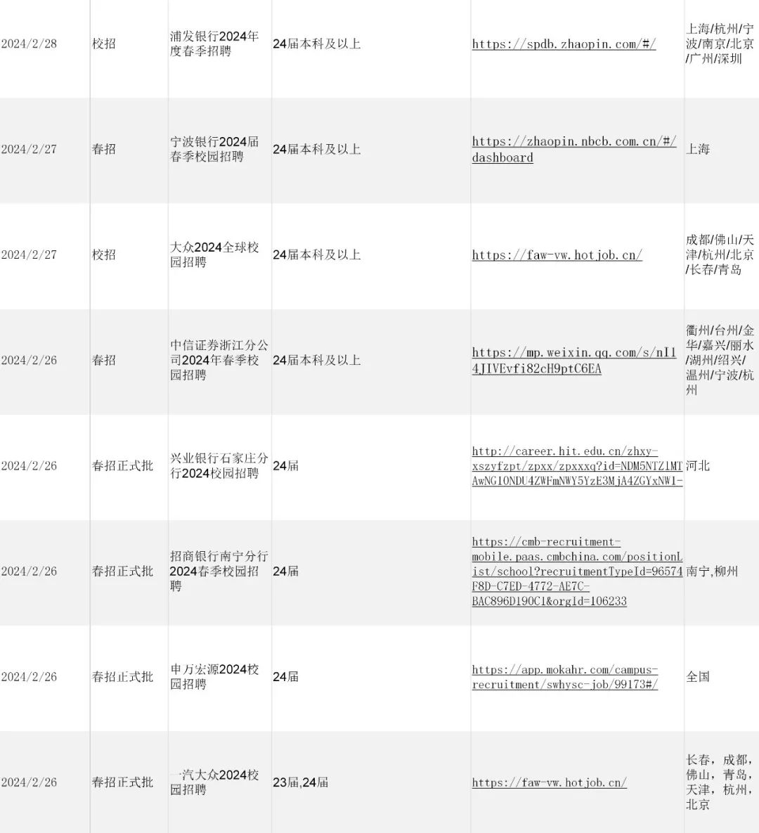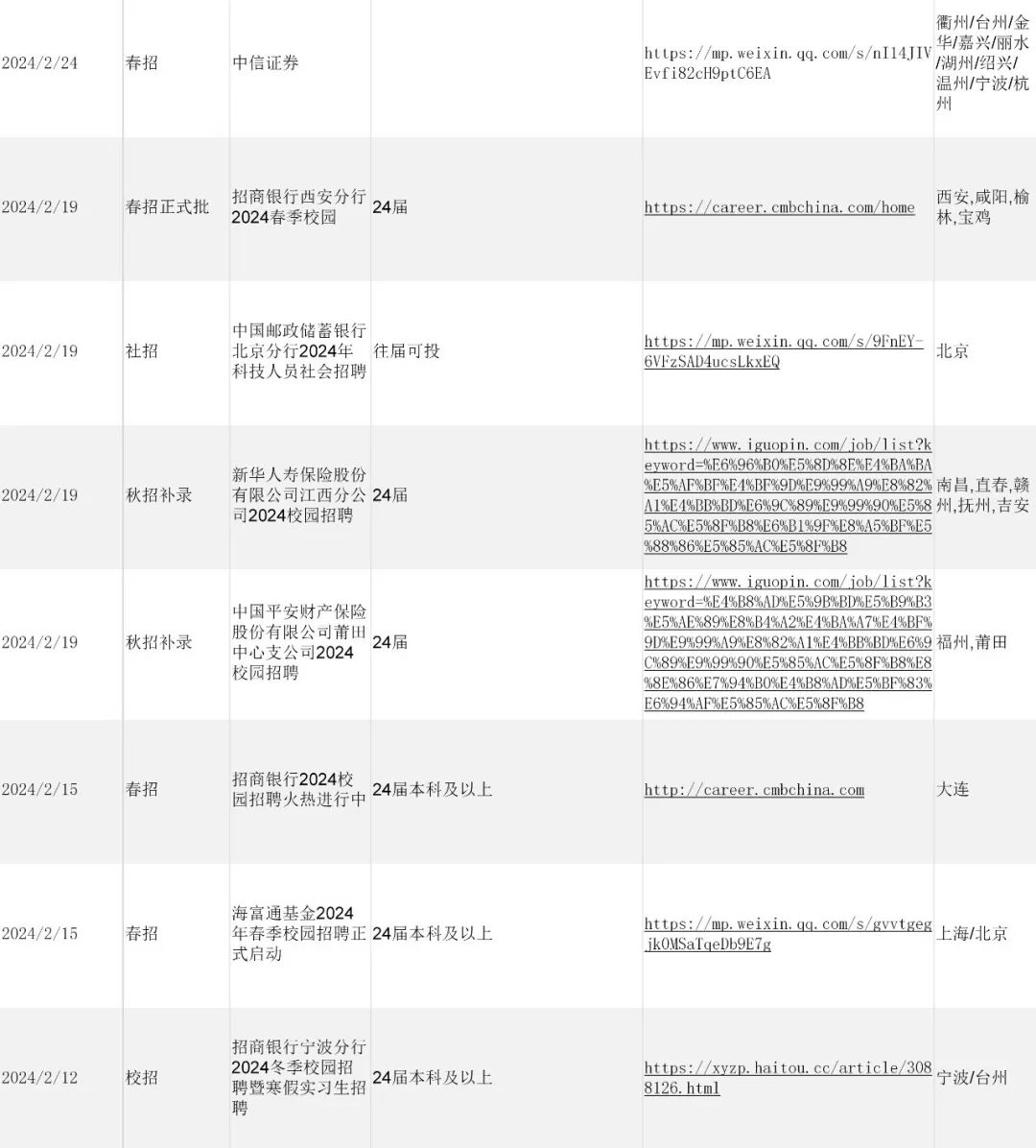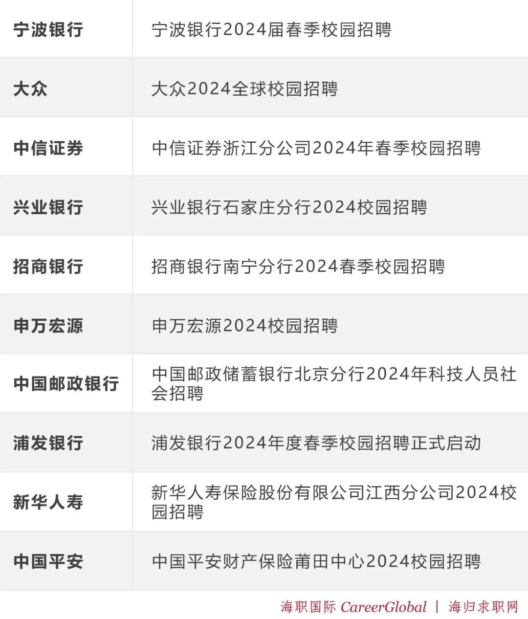 本期内容涵盖宁波银行、大众、中信证券、兴业银行、招商银行、申万宏源、中国邮政银行、浦发银行、新华人寿、中国平安等广大留学生海归最为关注的国企领域1000+热门岗位。
