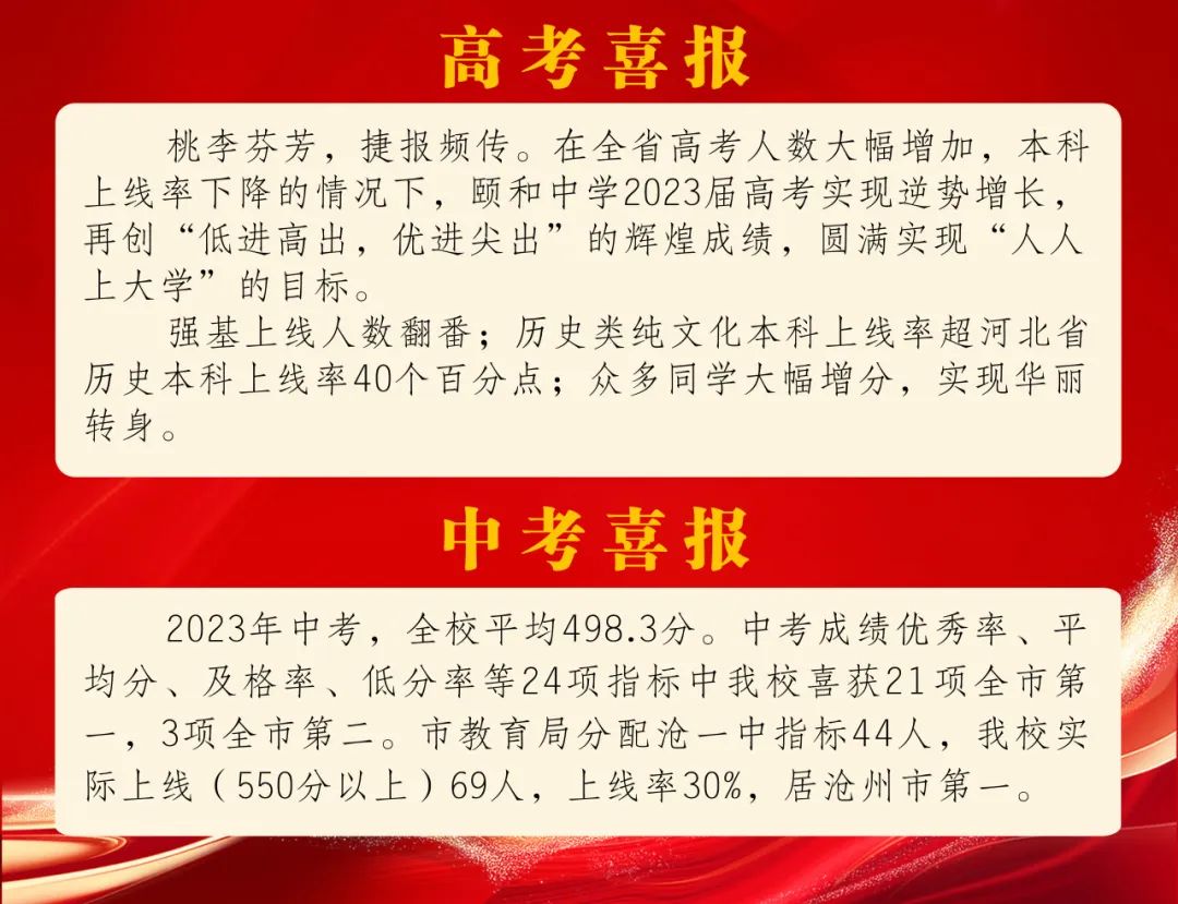 沧州市颐和中学创办于2005年,坐落于沧州市运河区。建校十九年来,专家办学,理念先进,形成了一套成熟、规范、科学的治学模式,打造了一支结构合理、乐教爱生的高素质教师队伍,以优良的校风、严谨的教风、求实的学风、优异的成绩,赢得了学生、家长和社会的赞誉。