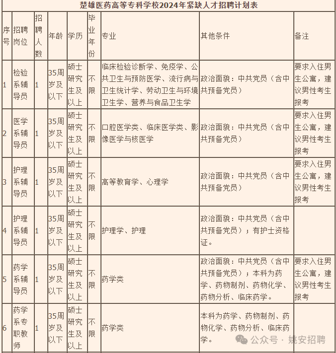 附件下载:附件1:楚雄医药高等专科学校2024年紧缺人才招聘计划表.xlsx