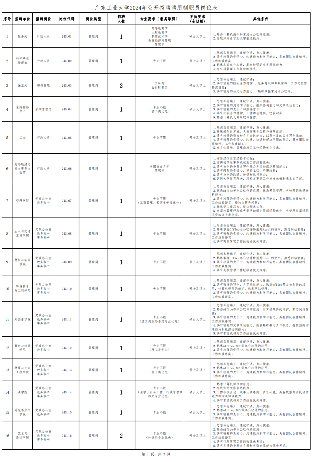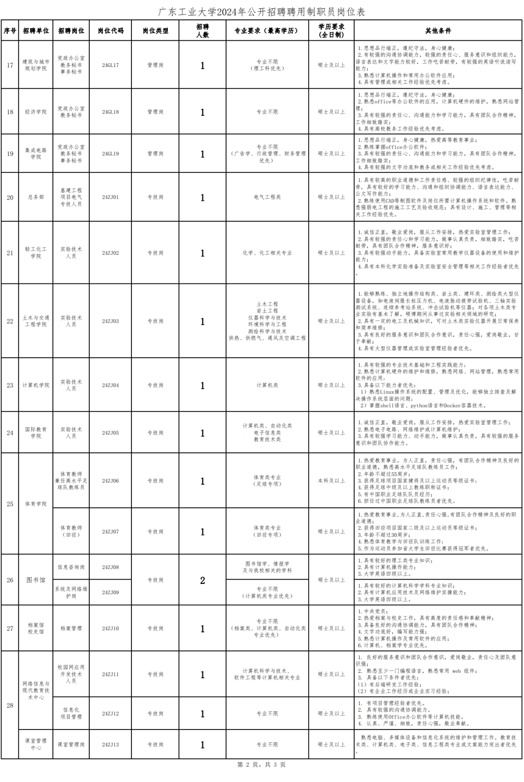 5、具备报考岗位所需其他条件。详见《 附件1:广东工业大学2024年公开招聘聘用制职员岗位表》。
